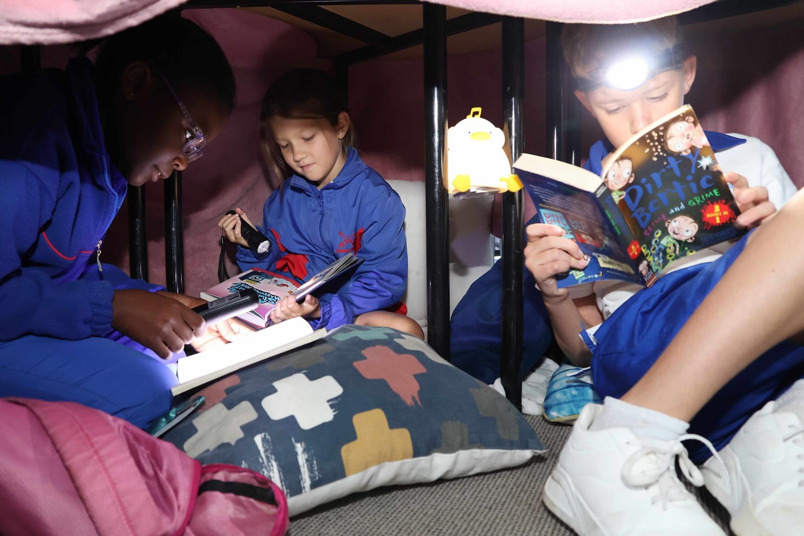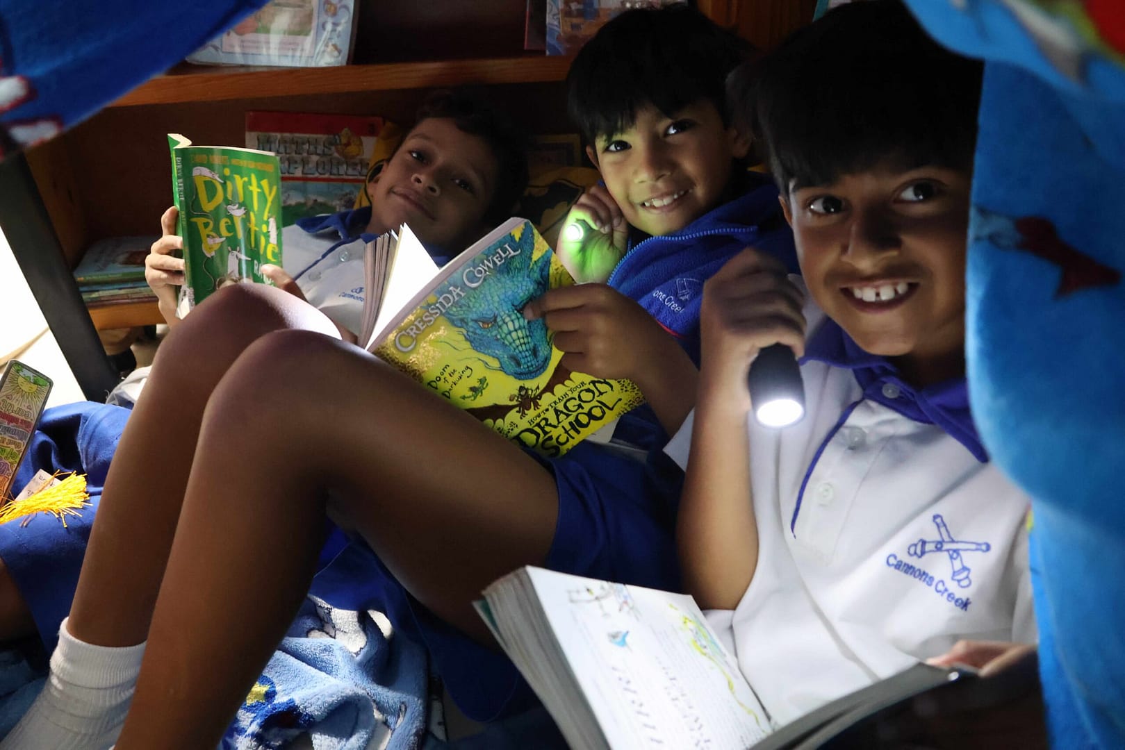 Lights out, sotires on – Grade 3 pupils got cosy for Torch Thursday – Rebecca Marjawar, Hunter Classen, and Benjamin Brett.
