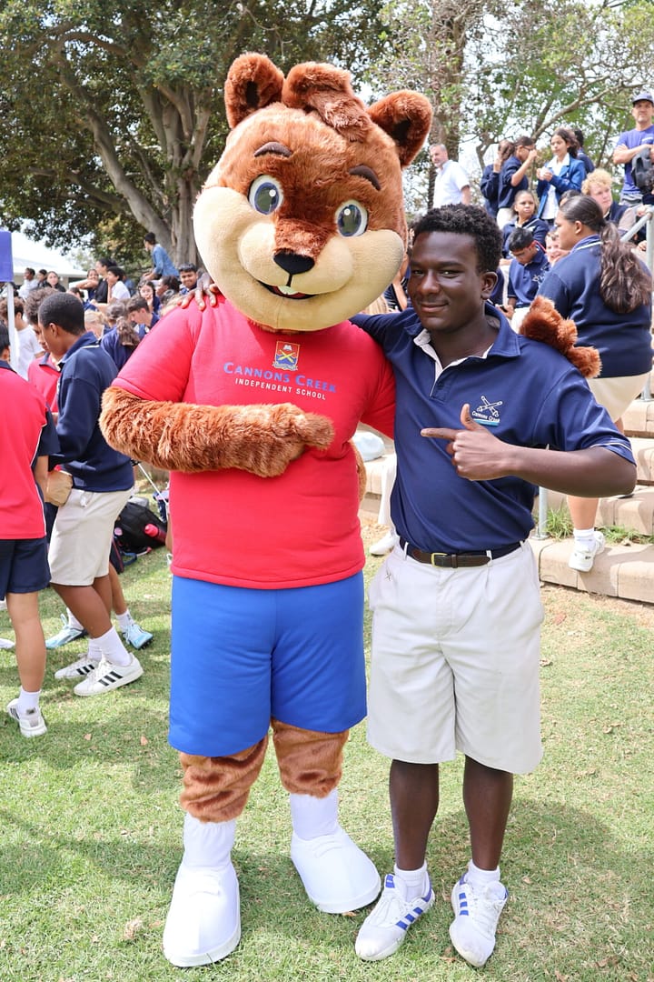 The Cannons Creek mascot stands proudly with Grade 11 pupil Ludovic Nkomba, with the Cannons Creek supporters in the background.