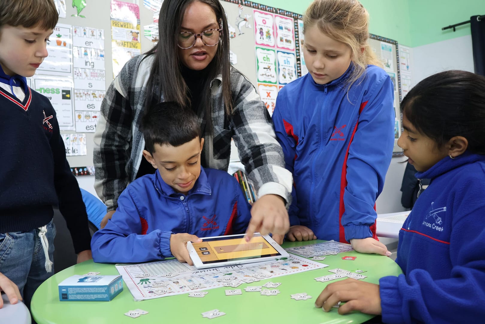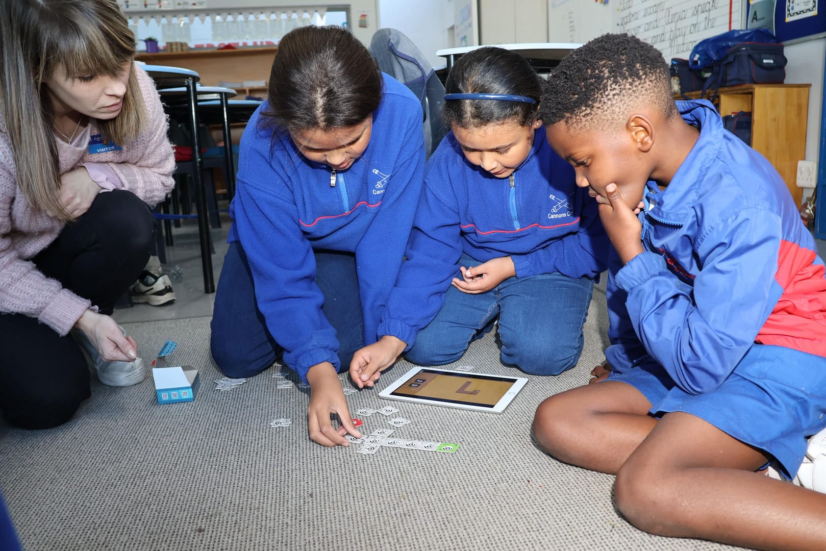 . Melanie Voegt (Librarian) assists Harry Pringle, Aaron Challis, Rori Rooseboom, and Lea Dorasamy with the scanning of coding tokens in order to solve the problem on the iPad, where pupils needed to place the tokens on the grid mat in their desired sequence.