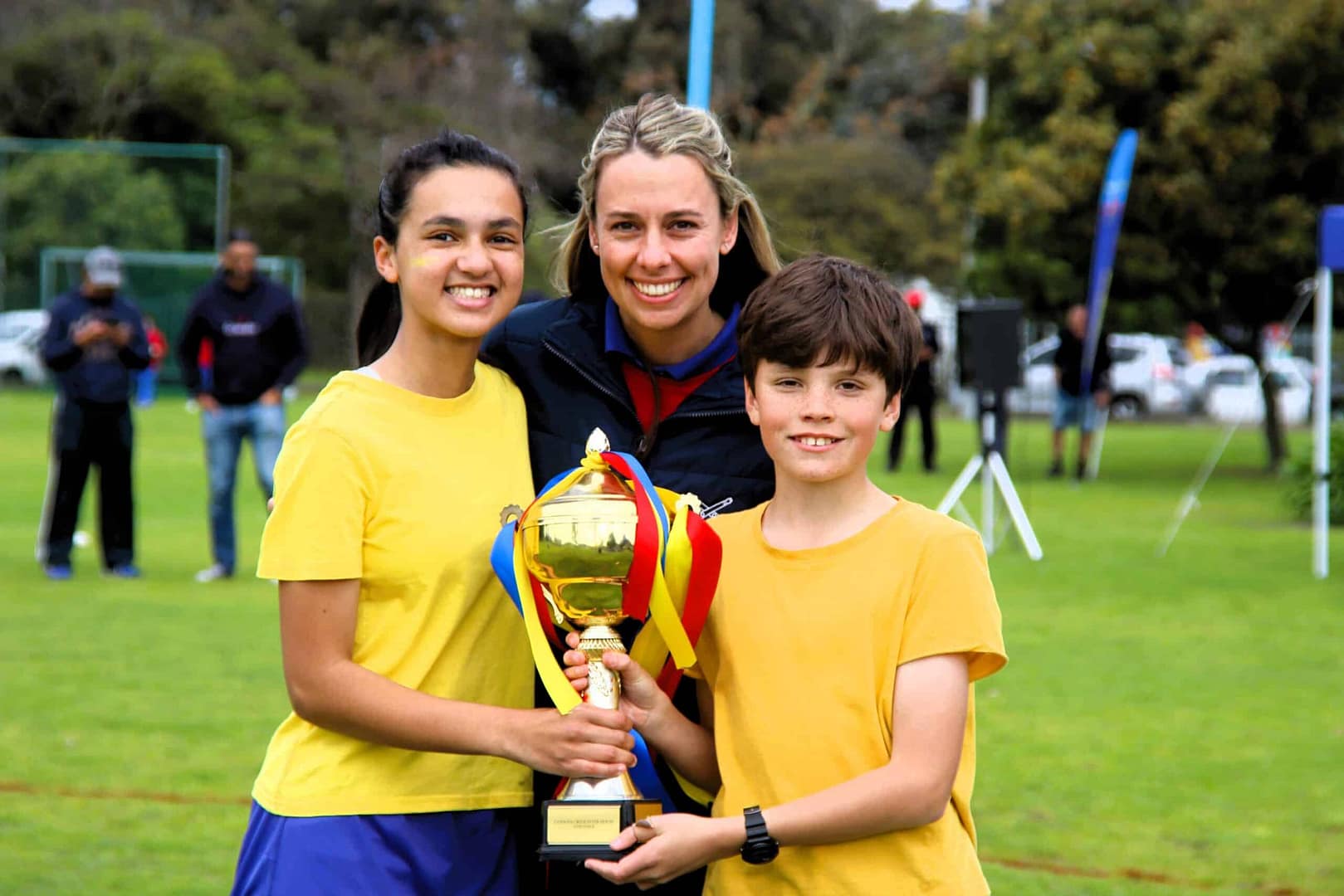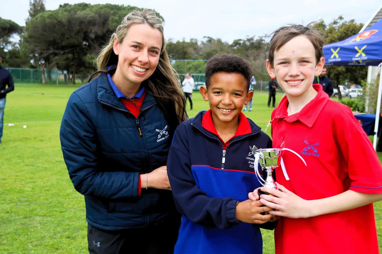 Riverside Grade 6 representatives David Jacobs and Seth du Plessis with the Spirit Cup, and Mrs Ju-Anita Skea (Head of Sport)