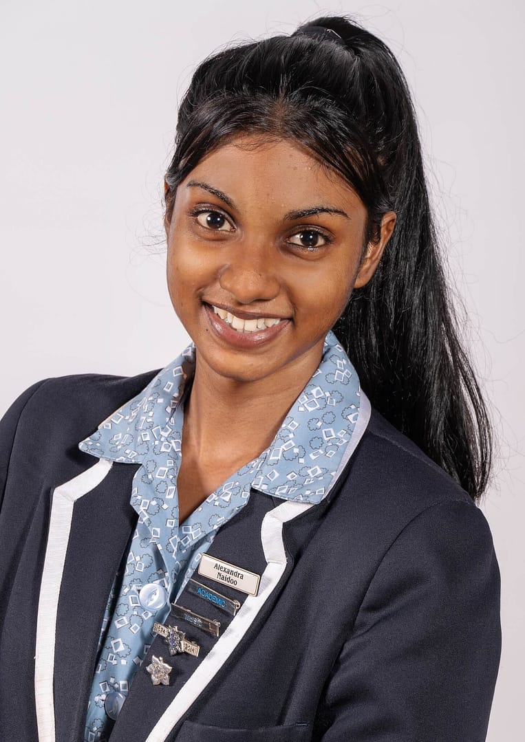 Alexandra Naidoo: English HL, Afrikaans FAL, Mathematics, Life Orientation, Accounting, Life Sciences, Physical Sciences