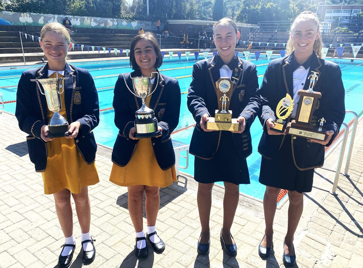Van links is Caileigh de Beer (namens die o.14-wenspan), Nanette Jordaan (namens die o.16-wenspan), Miché Johns (namens die o.19-wenspan) en Anieke Helmand (swemkaptein en beste swemmer 17 jaar en ouer).