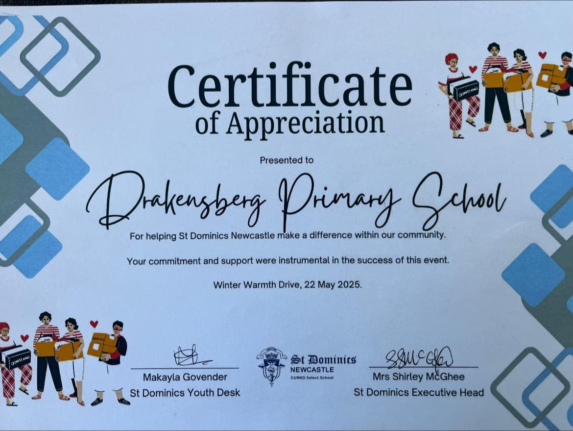 Drakensberg Primary School have been part of the Winter Warmth Drive, driven by St Dominics Newcastle! What an honour to serve our community alongside other local schools and businesses. A heartfelt thank you to our incredible Drakensberg Primary School learners and parents for every single donation — your generosity truly made a difference. A special shoutout to St Dominics for leading this amazing initiative and turning it into such a meaningful success!