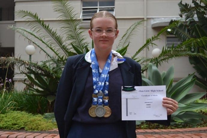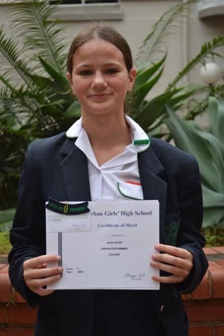 Durban Girls’ High School swimming success: Kate Truter competed in the SA Open Water Champs in Jeffreys Bay. She represented KZN and swam the 3km event, beating her Personal Best by almost 4 minutes! She placed in the Top 10 in her age group. Kate was awarded Colours for her achievement.