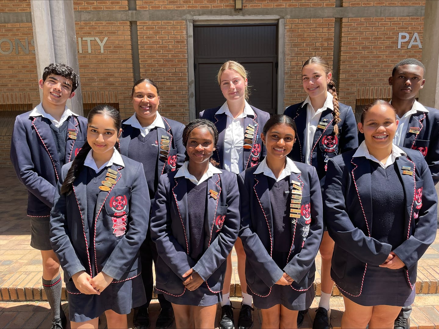 Senior Prefects 2025/2026 In order as on the photo. Front Left to Right Thaania Omar- Academics Alice Mtwa- Grade 9 Amirah Parker- Sport Gemma Telemachus- Discipline Back Left to Right Luca de Oliveira- Culture Hannah Joachims- Service Kaylee Fennell- PR and Marketing Jaylea Centner- Grade 8