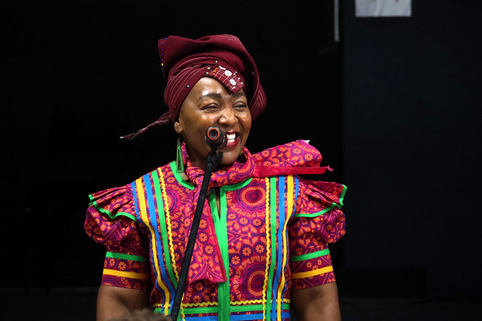 . Linomtha Nobuhle entertaining and educating the Grade 4-6 pupils about the intricacies and beauty of the isiXhosa language.