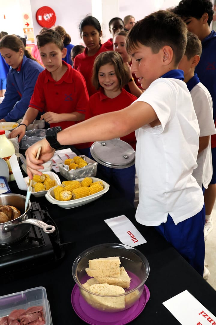 Grade 5 pupil Ronan Potgieter dishing up Ulusu (tripe) for his classmates