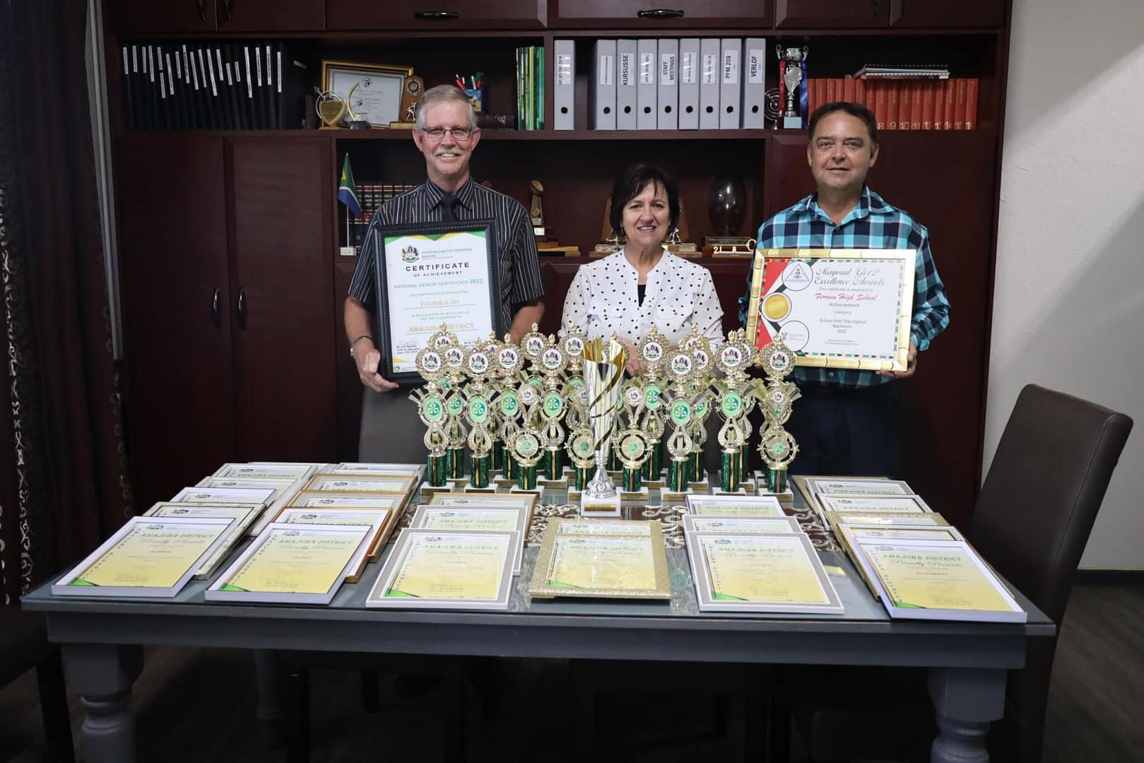 Mr Steven Wilmans (Deputy Principal of Academics), Ms Charmaine Myburgh (Principal) and Mr H Strauss (Deputy Principal), proudly standing with all the awards received by the excellent educators of Ferrum High School.