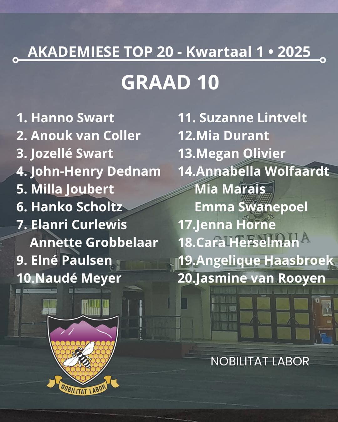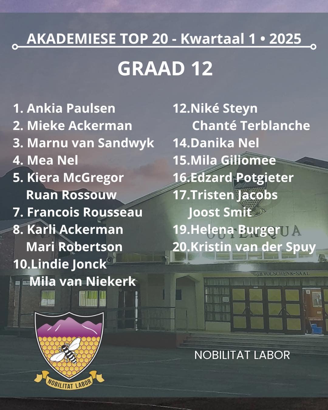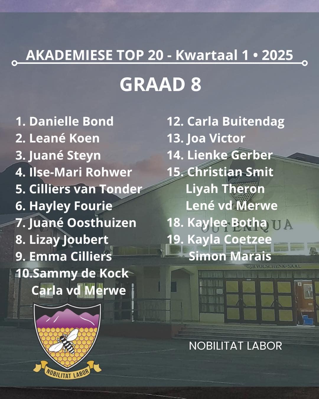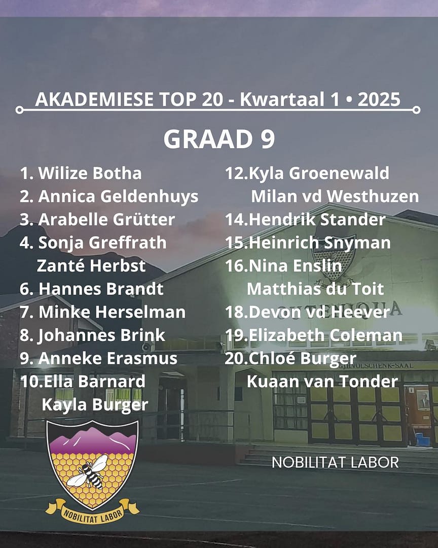 Hiermee die Akademiese top 20 vir kwartaal 1 van Hoërskool Outeniqua