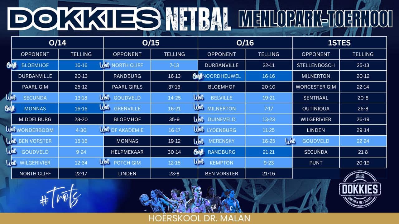 Hoërskool Dr Malan skitter by die Menlopark-toernooi! Die netbal-dokkies het die afgelope naweek alles op die baan gelos tydens die Menlopark-toernooi. Dit was ’n naweek van intense kompetisie, ongelooflike spangees en uithouvermoë. Van naelbyt-gelykop uitslae tot klinkende oorwinnings teen van die land se top skole. Ons is ongelooflik trots op elke speler.