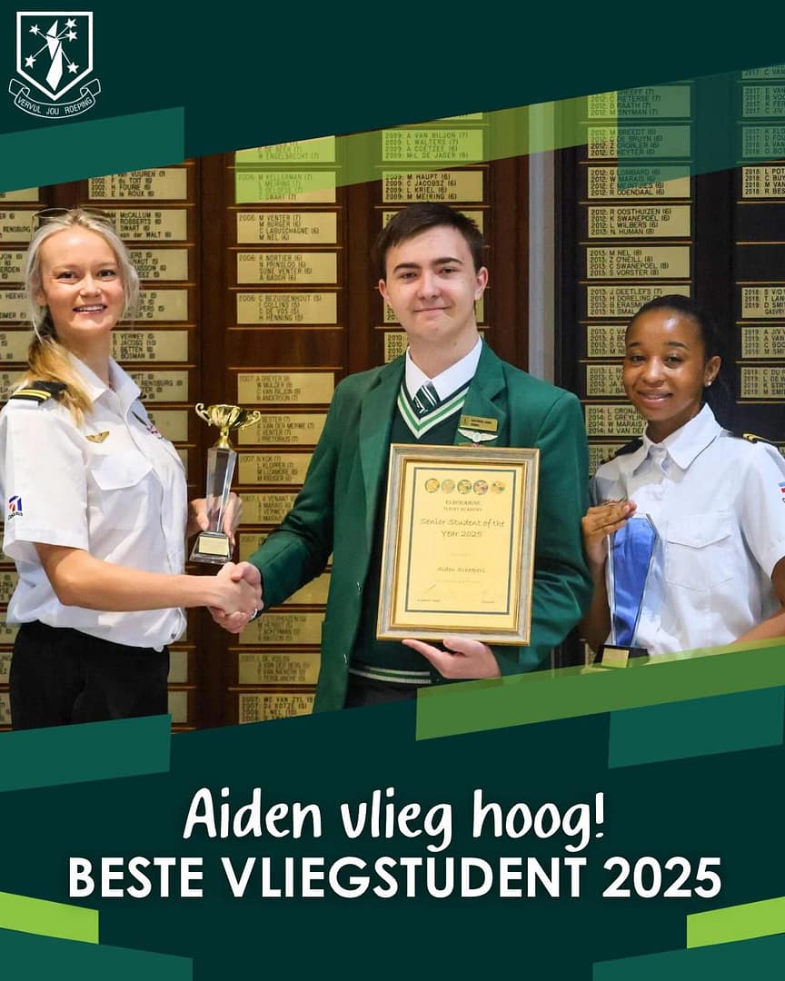 Baie geluk aan Hoërskool Eldoraigne se Aiden Scheepers wat deur die Eldoraigne Vliegakademie aangewys is as Senior Vliegstudent van die Jaar vir 2025. Hy ontvang ook die toekenning vir Beste Vliegstudent Algeheel – ’n ongelooflike prestasie! Ons is baie trots op jou, Aiden. Ons hou jou dop en kan nie wag om te sien wat jou vliegtoekoms inhou nie!
