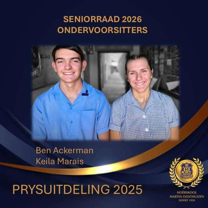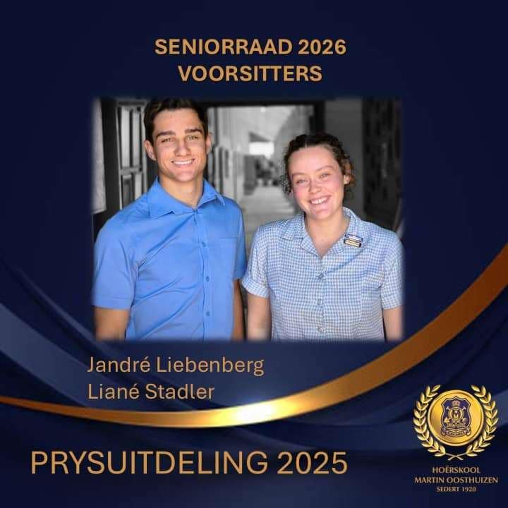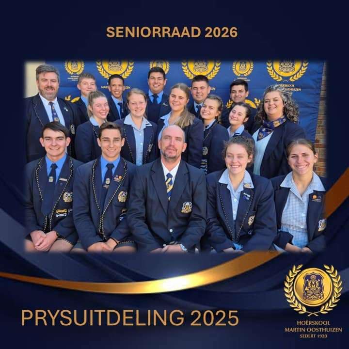 Baie geluk aan Hoërskool Martin Oosthuizen se Seniorraad 2026! Hulle nuwe seniorraad saam met die hoofleiers van 2026 is ook tydens die prystuidelingsgeleentheid bekende gemaak. Baie geluk aan die volgende leerders: