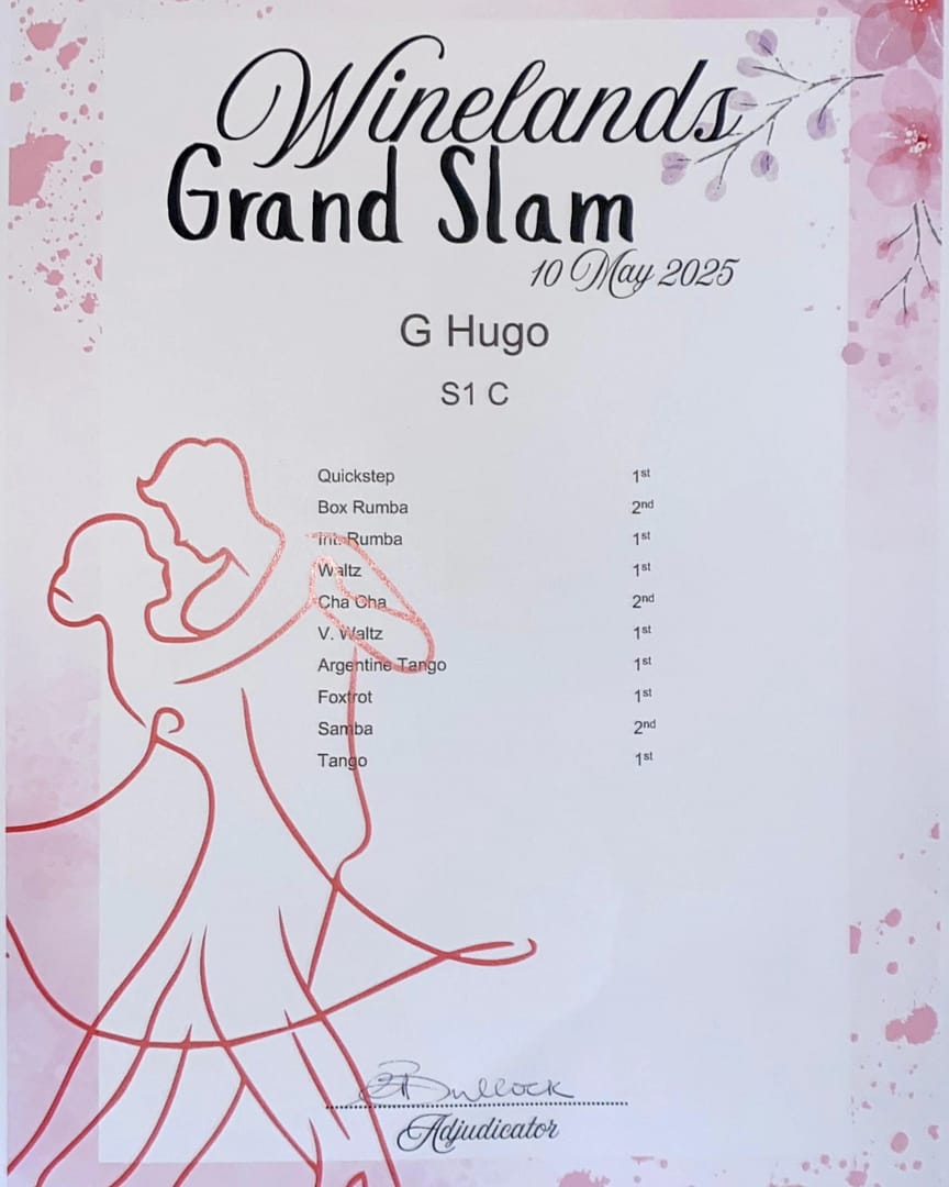 Gerrit Hugo skitter by die Wynland Grand Slam Streekskompetisie! Met ’n uitstaande vertoning in die Silwer 1-vlak vir die 16 – 22 jaar ouderdomsgroep, het Gerrit 1ste plekke behaal in 8 van die 11 danse, insluitend die tango, wals, foxtrot en die Argentynse tango. ’n Fantastiese vertoning wat sy talent en harde werk ten toon stel.