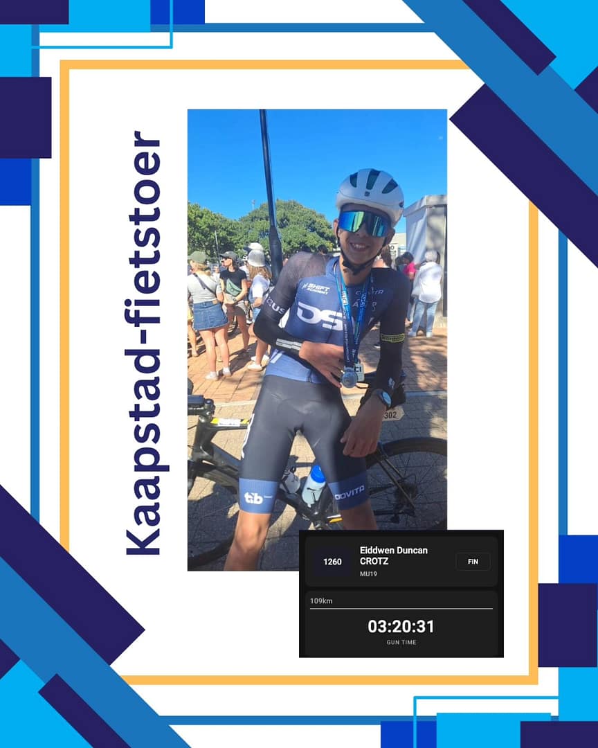 Baie geluk aan Eiddwen Crotz, ’n graad 11-leerder van Hoërskool Montana, wat aan die Kaapstad-fietstoer deelgeneem het. Hy het die uitdagende 109 km roete in ’n indrukwekkende 03:20:31 voltooi. ’n Fantastiese prestasie – ons is ongelooflik trots!