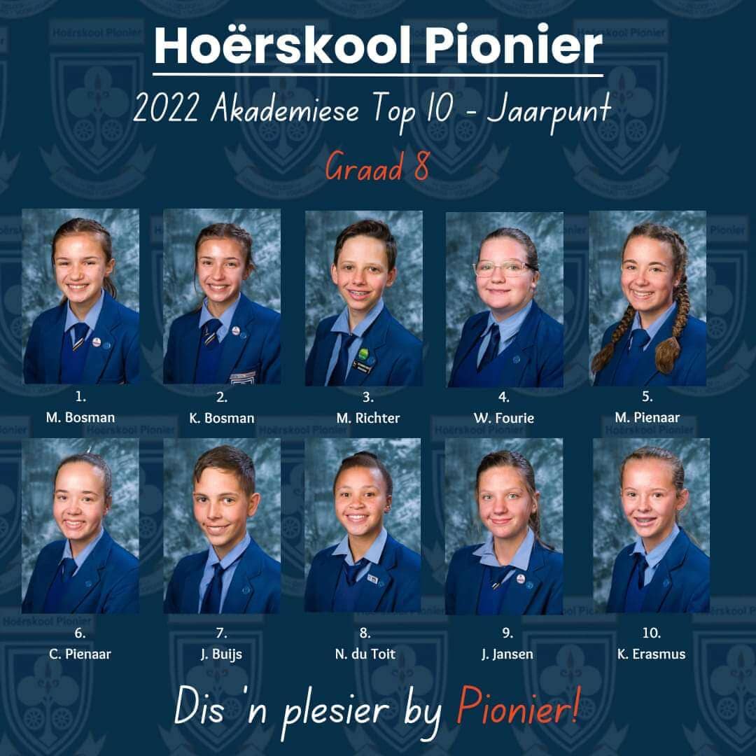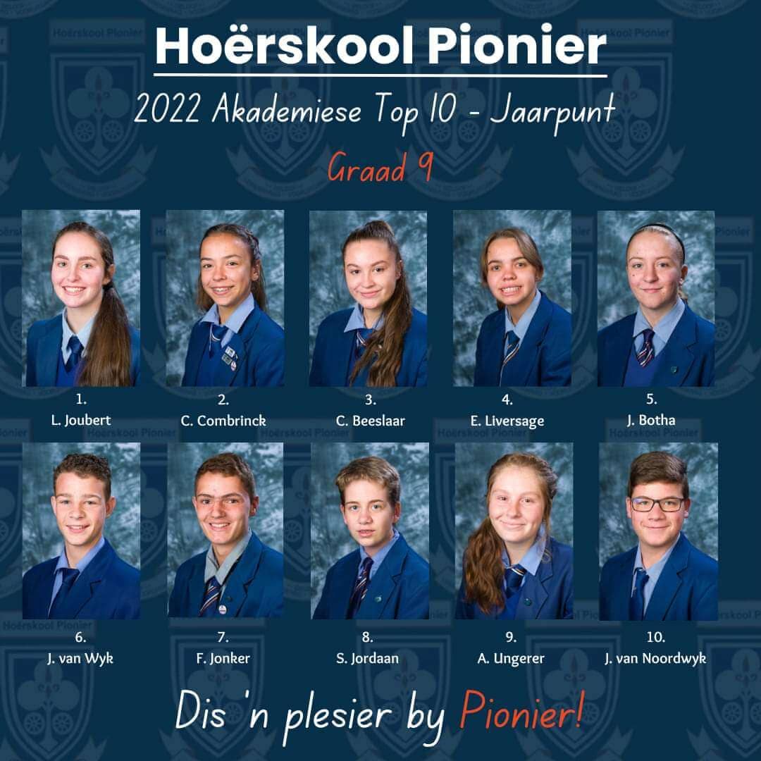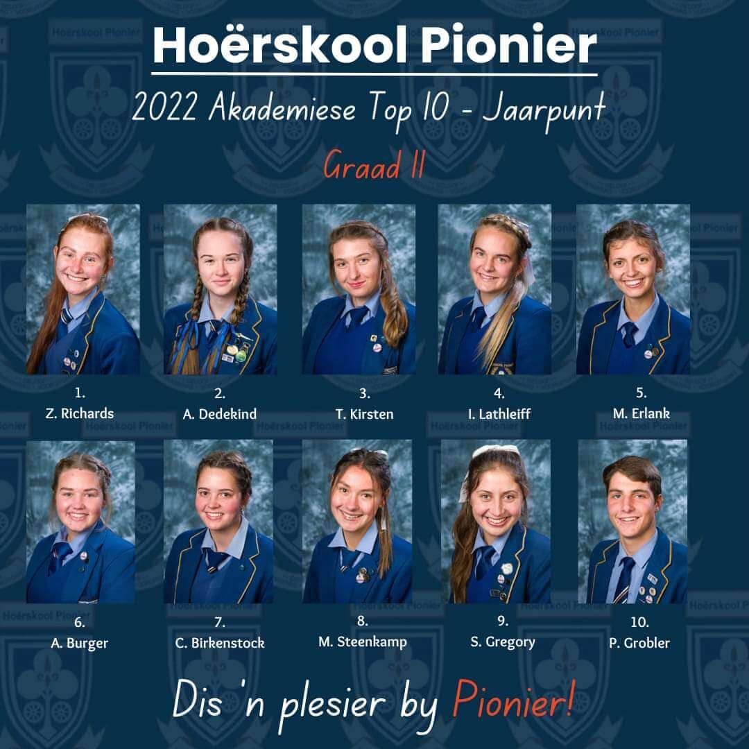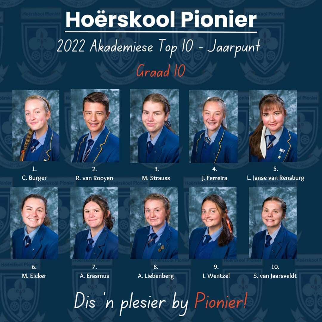 Hiermee Hoërskool Pionier se Akademiese Top 10 – Jaarpunt. Baie geluk aan elke leerder met uitstekende uitslae.