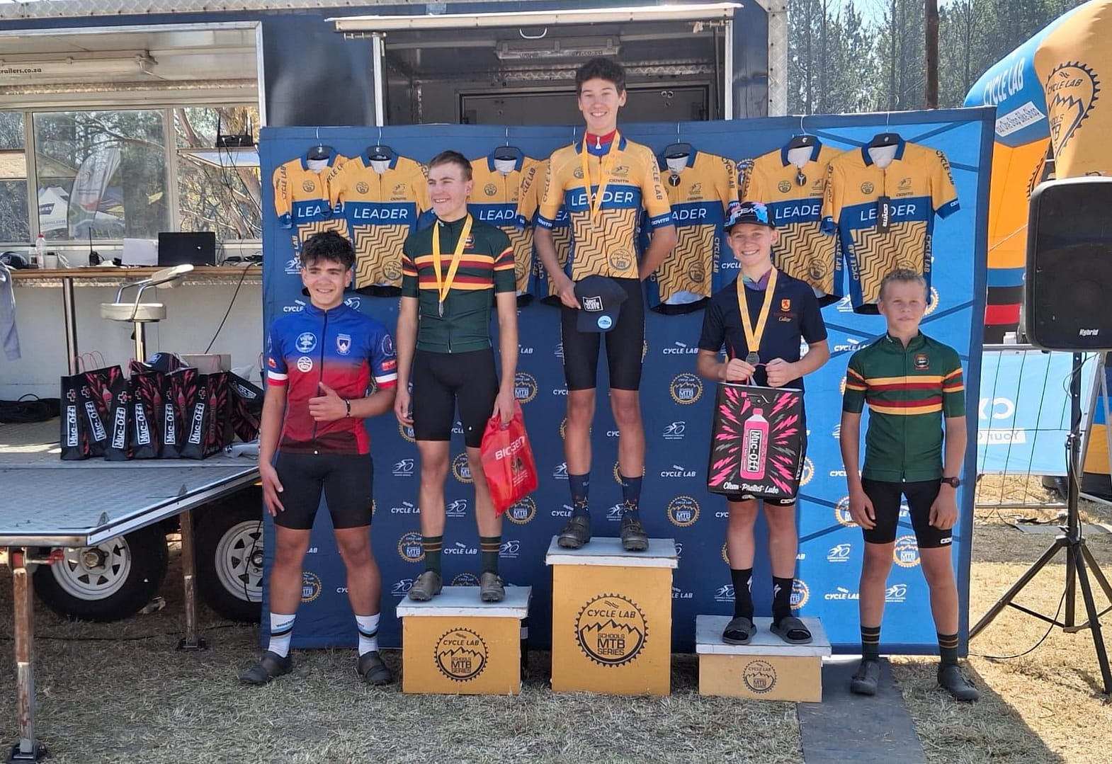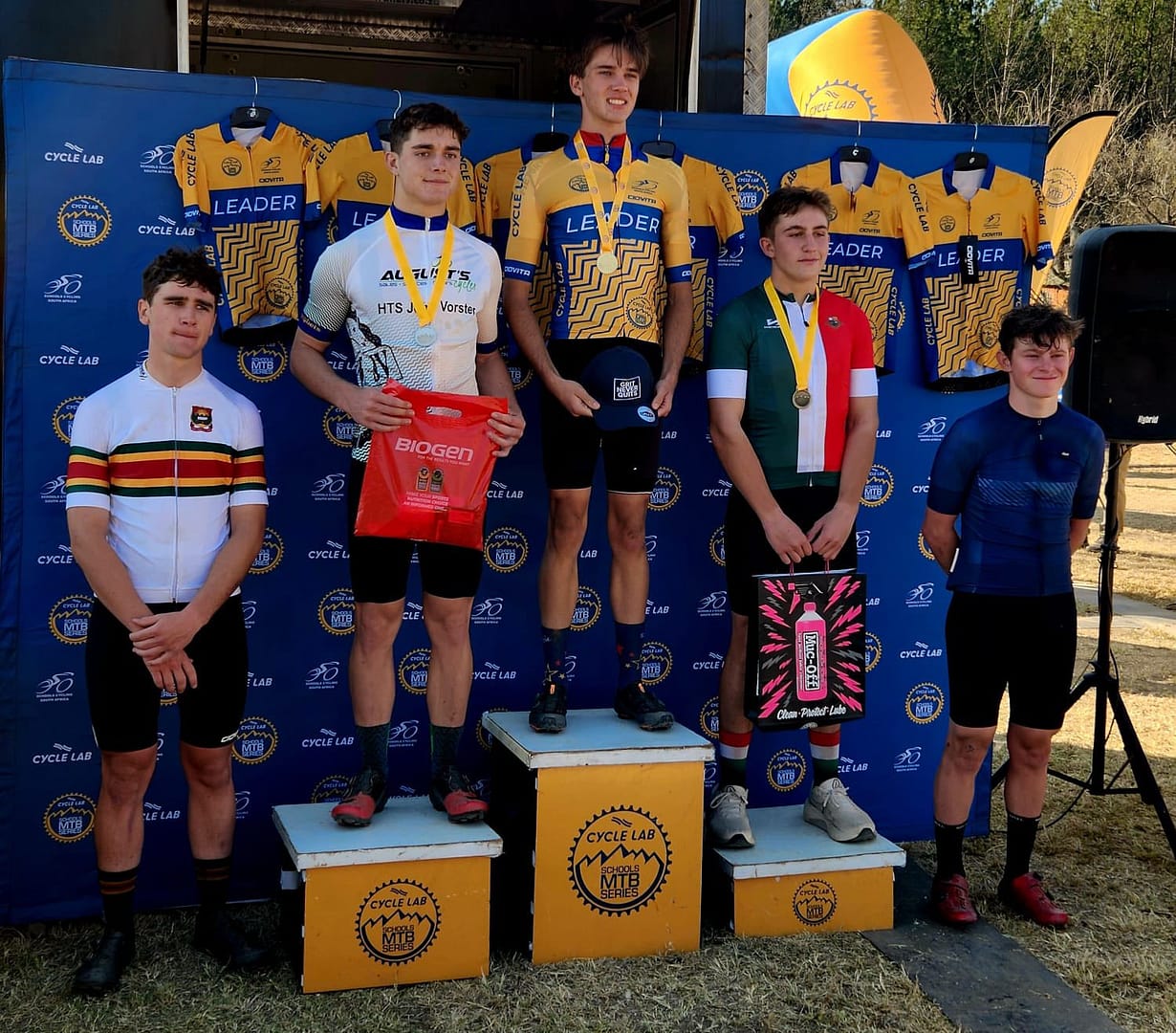 - 2 eerste plekke – wat dus die geel “race leader jerseys” kry (broers Evan en Jayden Naude)