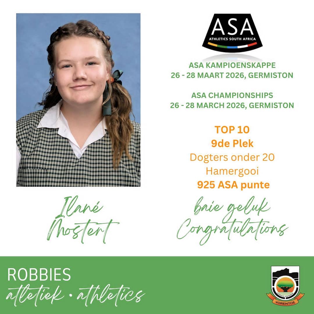 Baie geluk aan die volgende atlete wat die Hoërskool Rob Ferreira verteenwoordig het by die ASA Kampioenskappe in Germiston op 26-28 Maart! Spesiale melding aan Ilané Mostert en Trust Mkhabela vir hul prestasies!