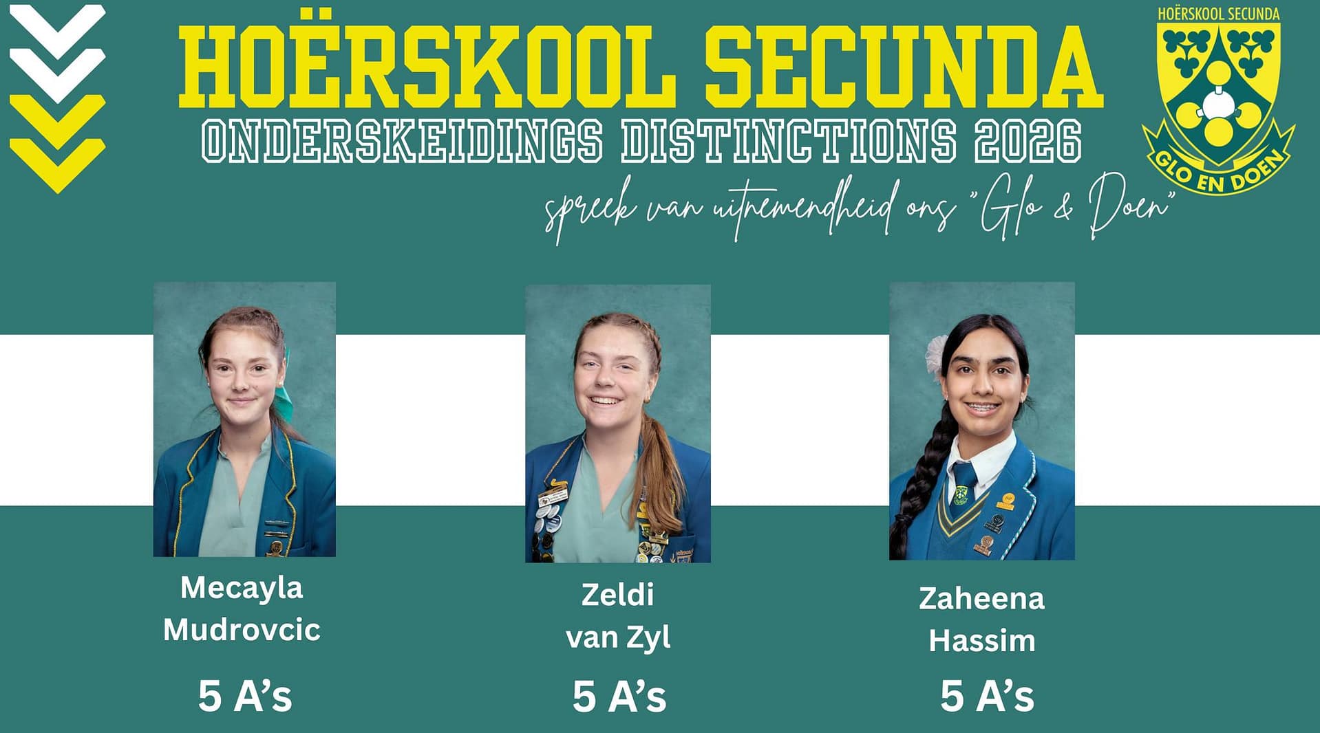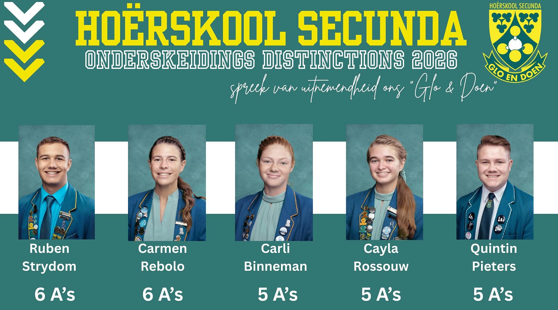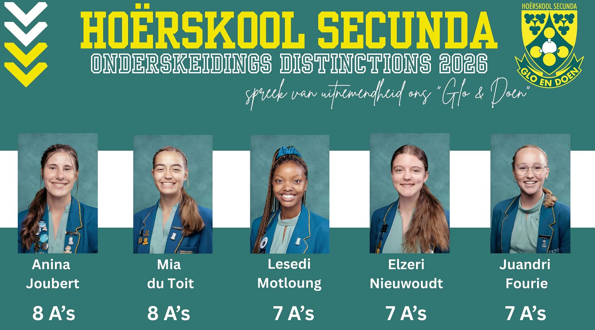 Baie geluk aan Hoërskool Secunda se ongelooflike Matriekuitslae van 2025. Ons is ongelooflik trots op Hoërskool Secunda se leerders van 2025. Spreek van uitnemendheid – ons “Glo & Doen”