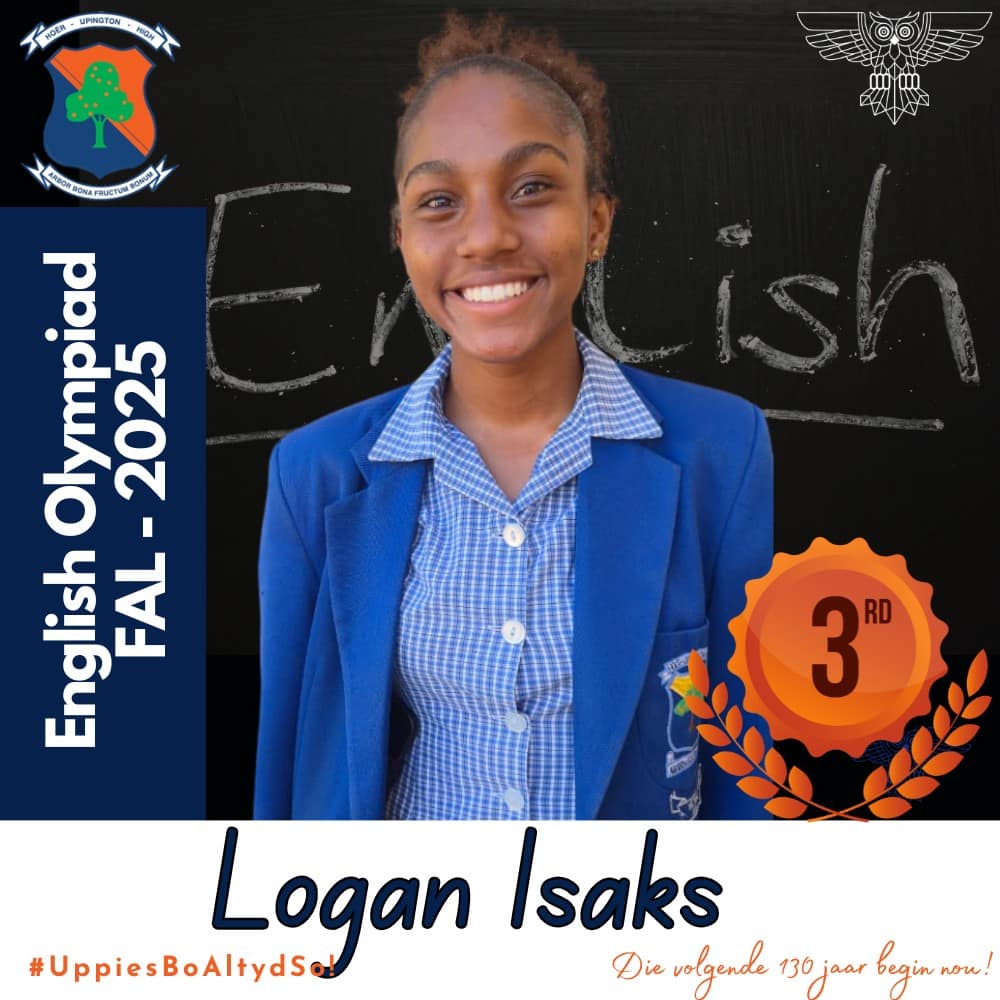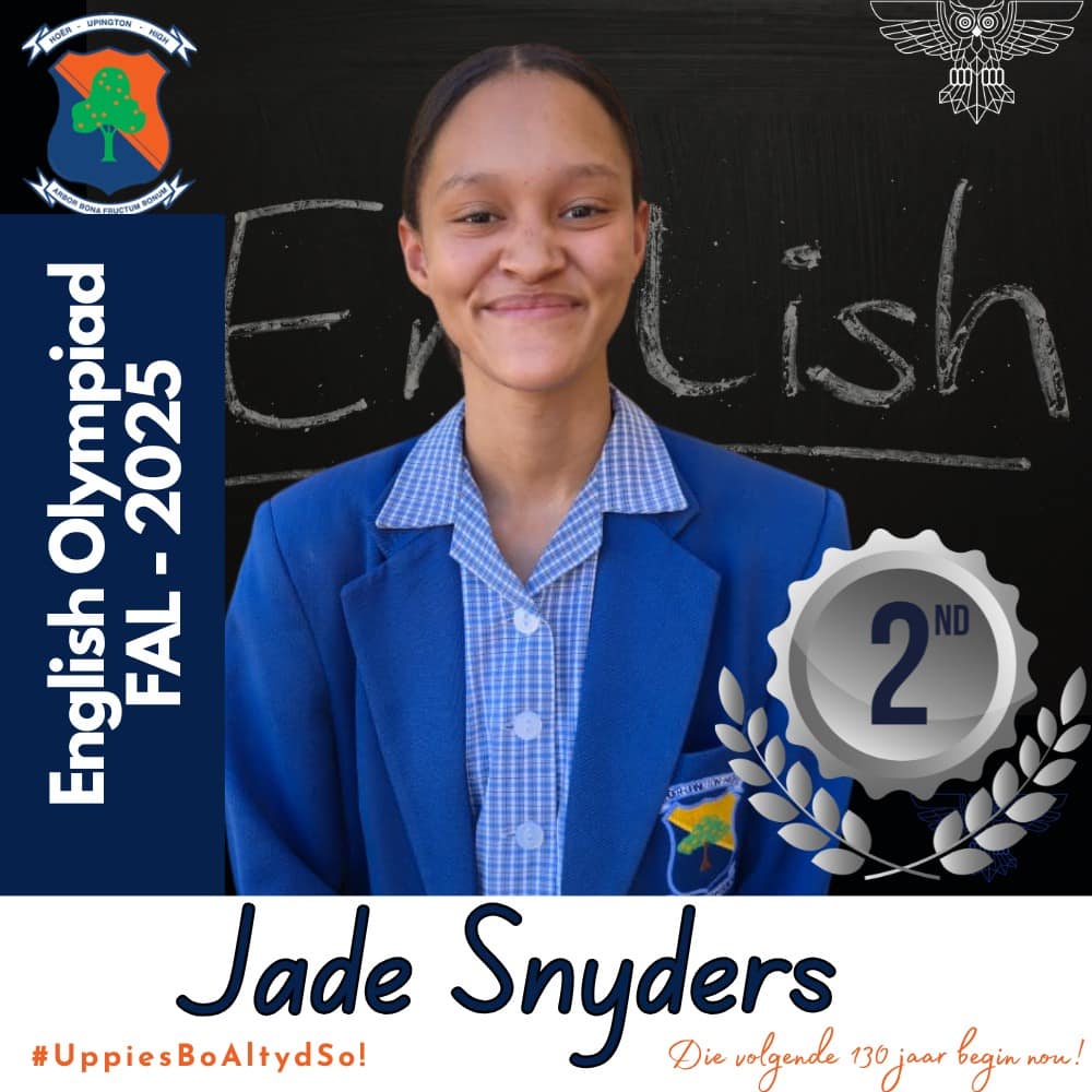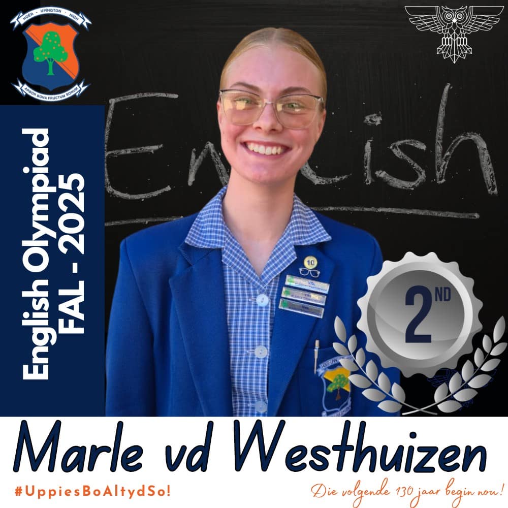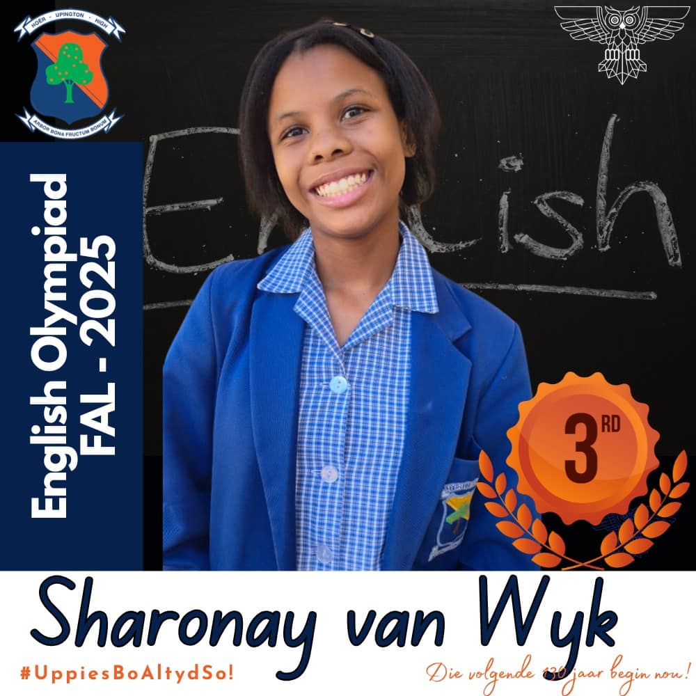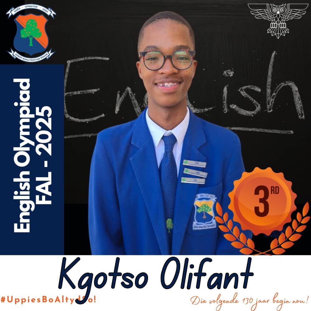 Hoërskool Upington wil graag ons leerders hartlik gelukwens met hul deelname aan die 2025 Engelse Olimpiade. Deelname aan hierdie gesogte kompetisie was ’n betekenisvolle prestasie vir almal wat betrokke was. Hierdie leerders se bereidwilligheid om hulself buite die klaskamer uit te daag, getuig van hul toewyding tot akademiese groei en uitnemendheid.