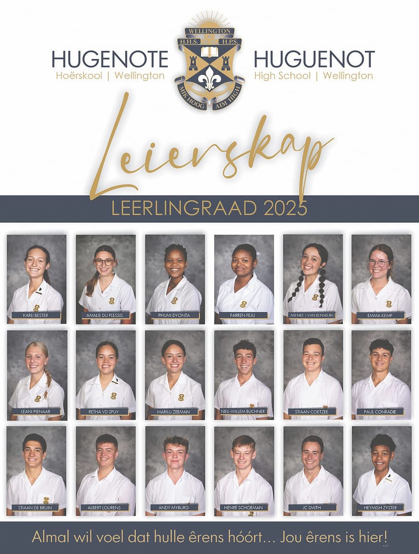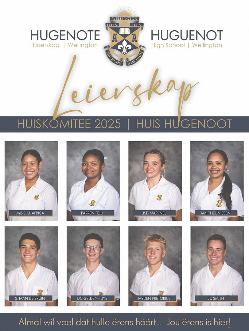 Baie geluk aan die volgende Hugenote Hoërskool leerders wat verkies is om hulle skool as leiers vir 2025 te verteenwoordig.