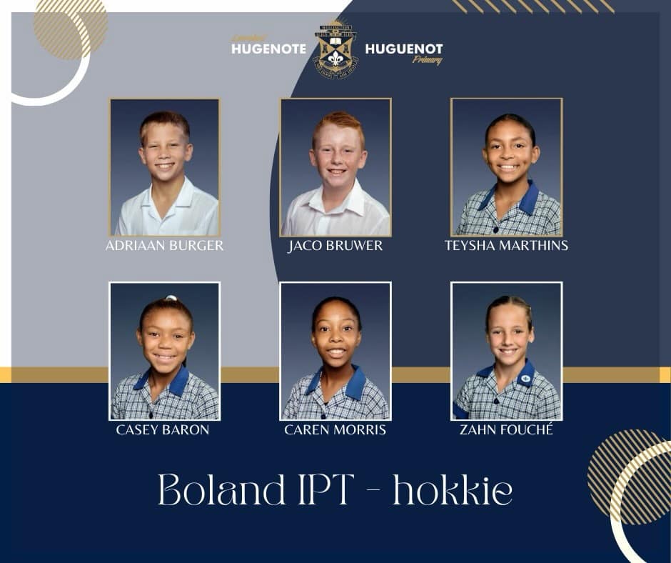 Hier is Hugenote Laerskool se spelers wat tot Boland Hokkie IPT- en streekspanne verkies is. Hulle sal tydens die komende skoolvakansie aan die IPT-toernooi in Johannesburg en die Streektoernooi in die Paarl deelneem. Hierdie hokkiesterre is: