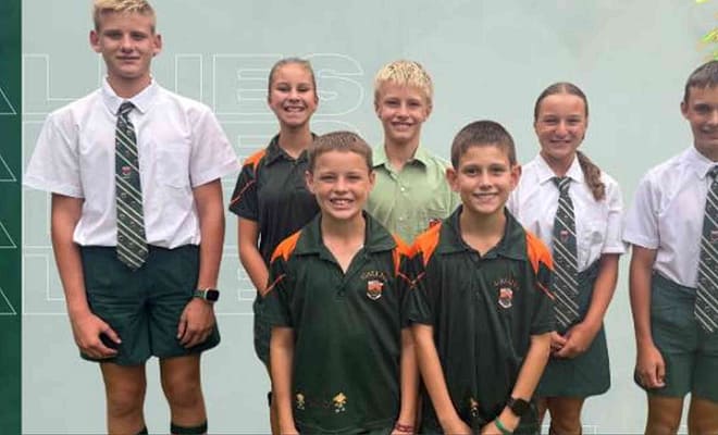 Agter van links na regs: Isabella Isaacs (hoogspring), Micah Beukes (100m & 150m), Haley Lintnaar (spiesgooi) en Skyller Christians (gewigstoot). Middel van links na regs: Zoey Jaftas (spiesgooi), Sashker du Plessis (spiesgooi) en Giana Africa (100m) .Voor: Addison Jones (60m & 80m).