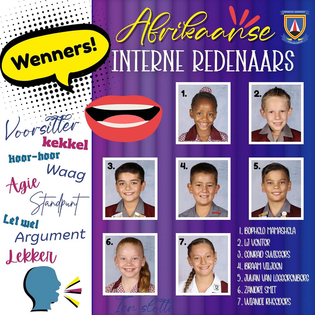 𝐏𝐚𝐬𝐨𝐩 𝐰𝐞̂𝐫𝐞𝐥𝐝 – 𝐨𝐧𝐬 𝐫𝐞𝐝𝐞𝐧𝐚𝐚𝐫𝐬 𝐡𝐞𝐭 𝐡𝐮𝐥𝐥𝐞 𝐬𝐭𝐞𝐦𝐦𝐞 𝐠𝐞𝐯𝐢𝐧𝐝! Baie geluk aan Laerskool Bakenkop wenners van die Interne Afrikaanse Redenaars van Gr 1 tot Gr 7. Julle het nie net gepraat nie… julle het geredeneer, oortuig en behoorlik indruk gemaak! Die beoordelaars moes mooi luister, die gehoor was vasgenael en ons is seker party ouers gaan nou by die huis agterkom dat ’n argument teen hierdie redenaars nie maklik gewen gaan word nie.