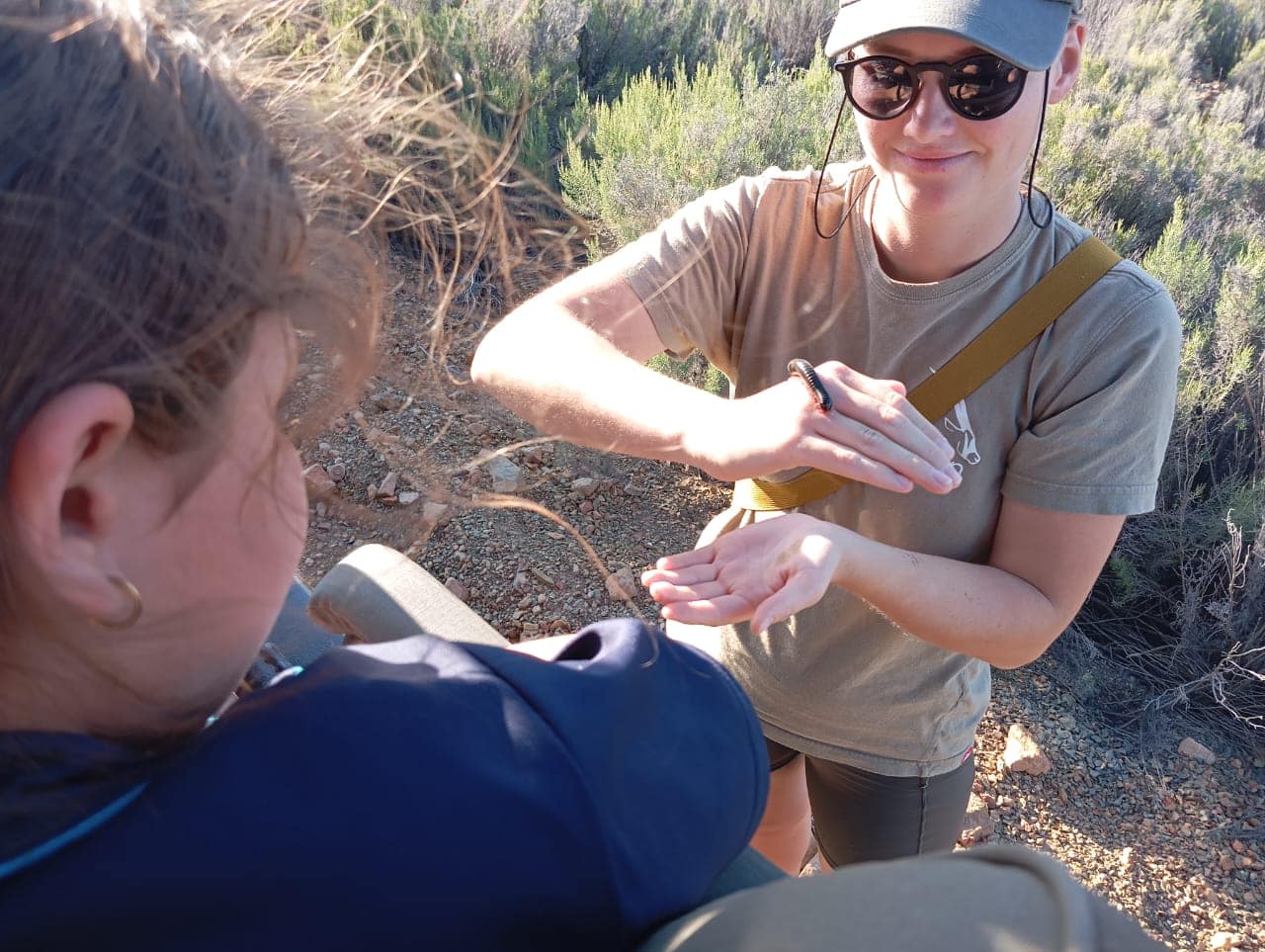 Me. Lina Grube (Drie Kuilen) hou ‘n pragtige groot duisendpoot vas vir een van die Groentjies, Cleonique Fourie, om te bekyk.