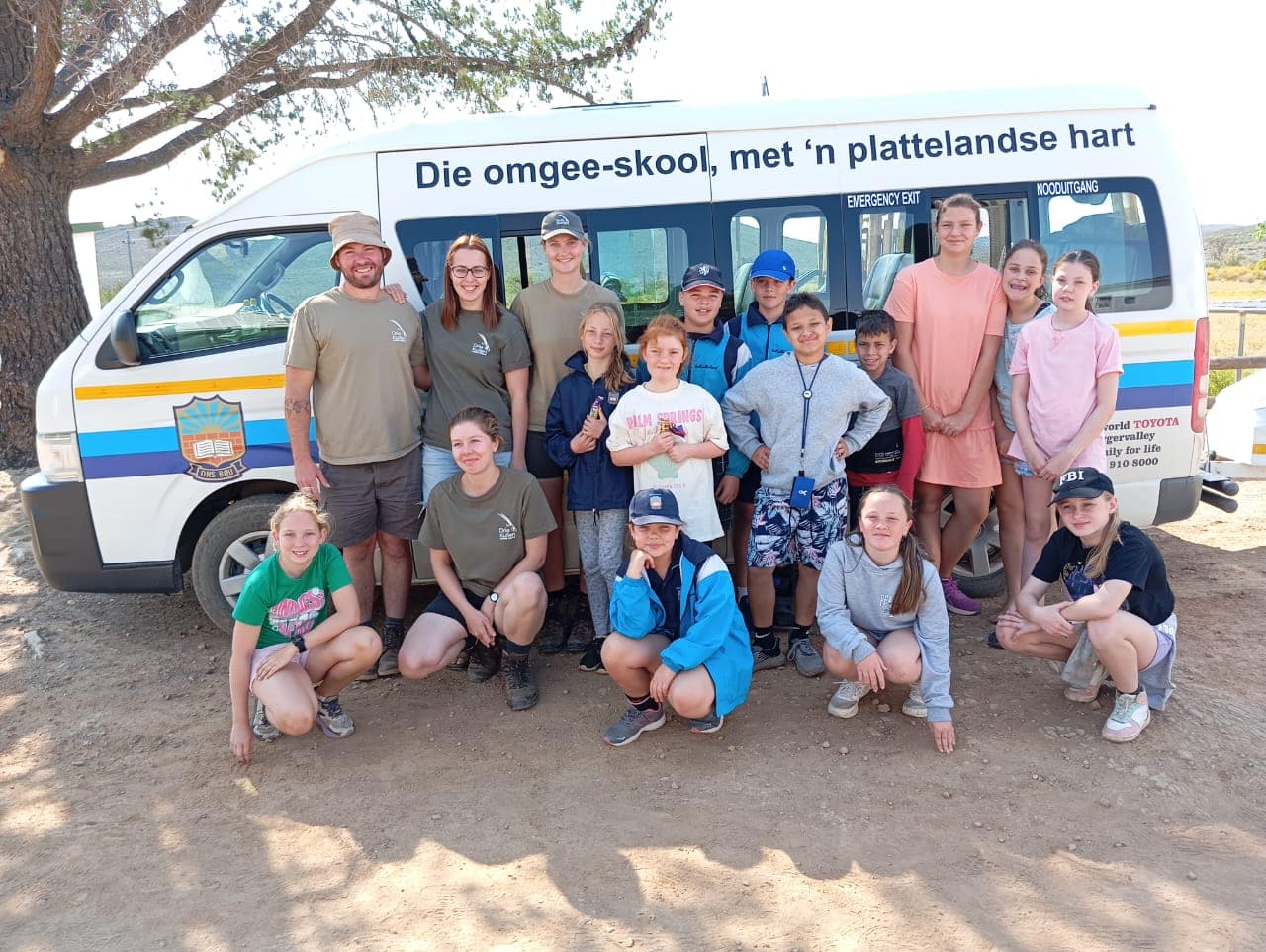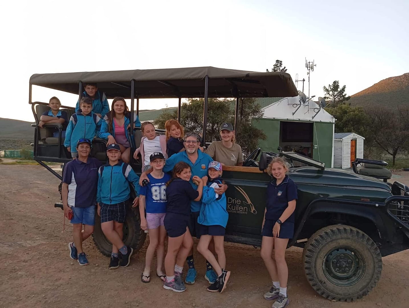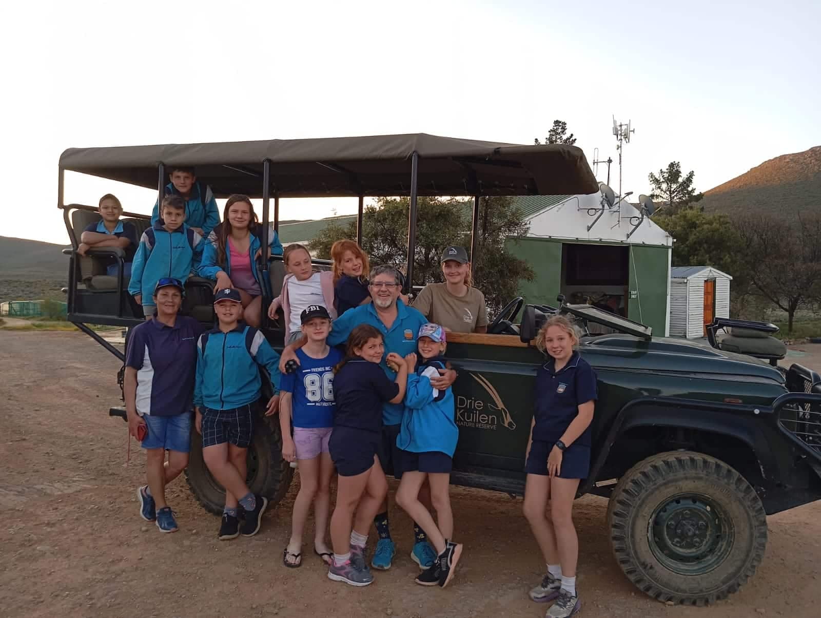 Me. Erika Rowbotham (heel links) en mnr. Corné Lötter (middel) saam met die Groentjiesklubkinders en me. Lina Grube (Drie Kuilen se eienaars se dogter wat die reservaat namens hulle bestuur) in die voertuig na afloop van die wildsbesigtigingsritte.