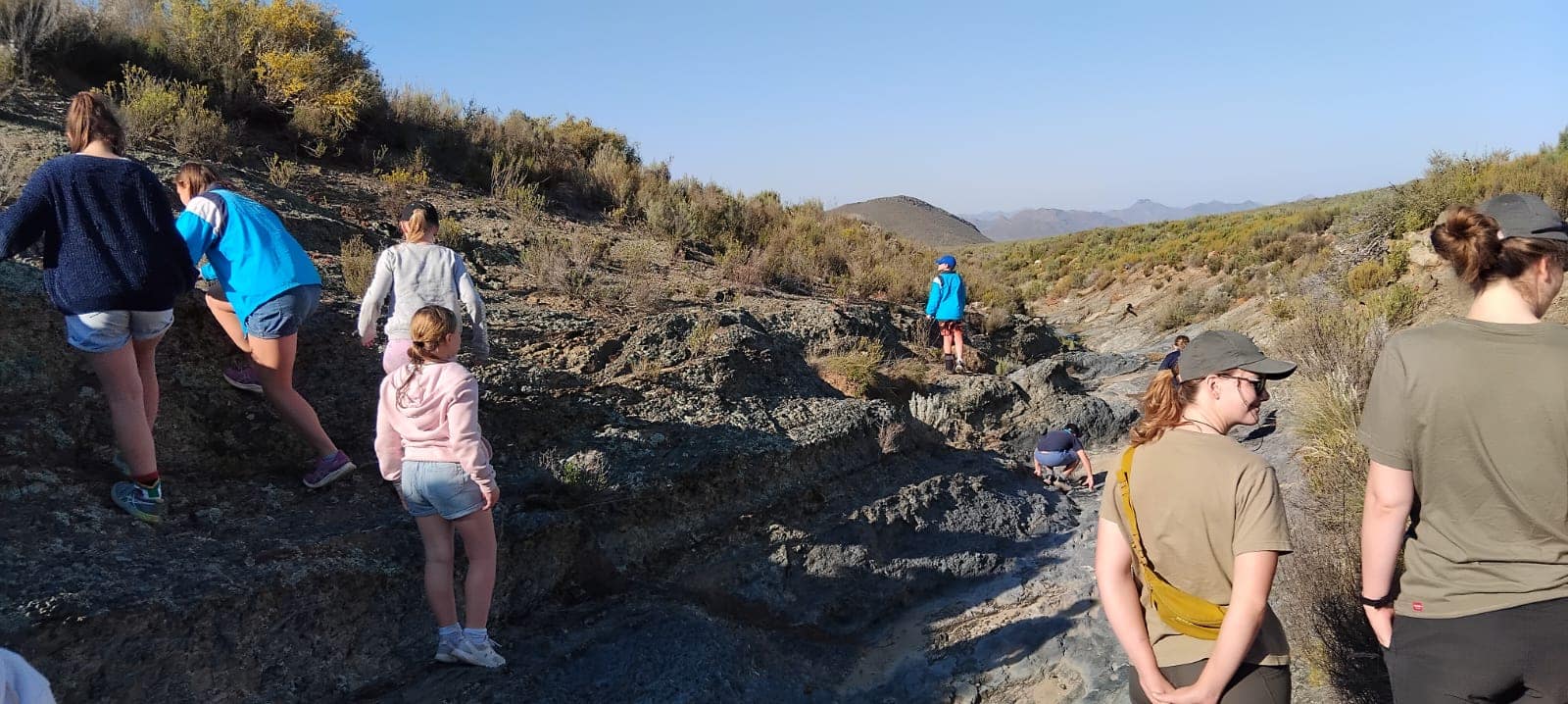 Ons het wel ook ‘n bietjie hard gewerk deurdat ons Drie Kuilen met hul erosiesloot-herstelprojek gehelp het deur klipmure in van die erosieslote te pak. Die personeel van Drie Kuilen was uiters vriendelik en het die besoek vir die klompie kinders baie aangenaam gemaak. Hul het ons tot fossiele gewys in een van die rivierlope daar.