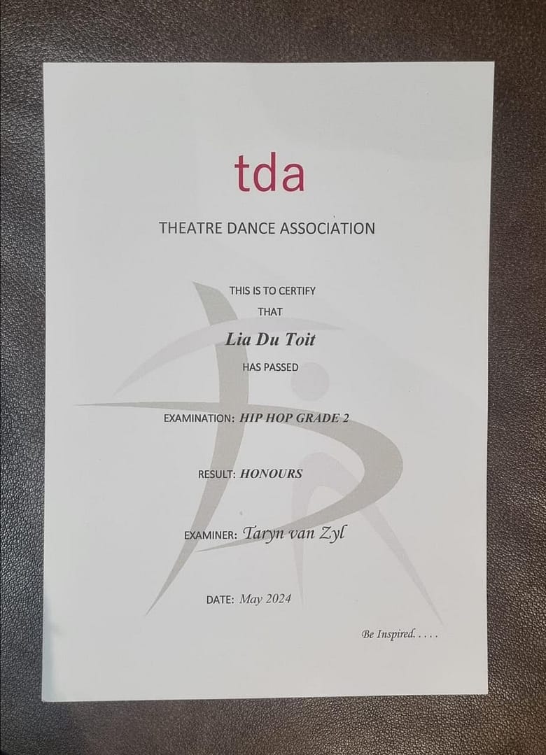 Baie geluk aan Laerskool Gansbaai danser Lia du Tiot wat haar Gr 2 Hip Hop eksamen met 82.5% Honours gegradueer het. Sy het die tweede beste in haar klas van 2024 gedoen en vorder na Gr3 Hip Hop dans.
