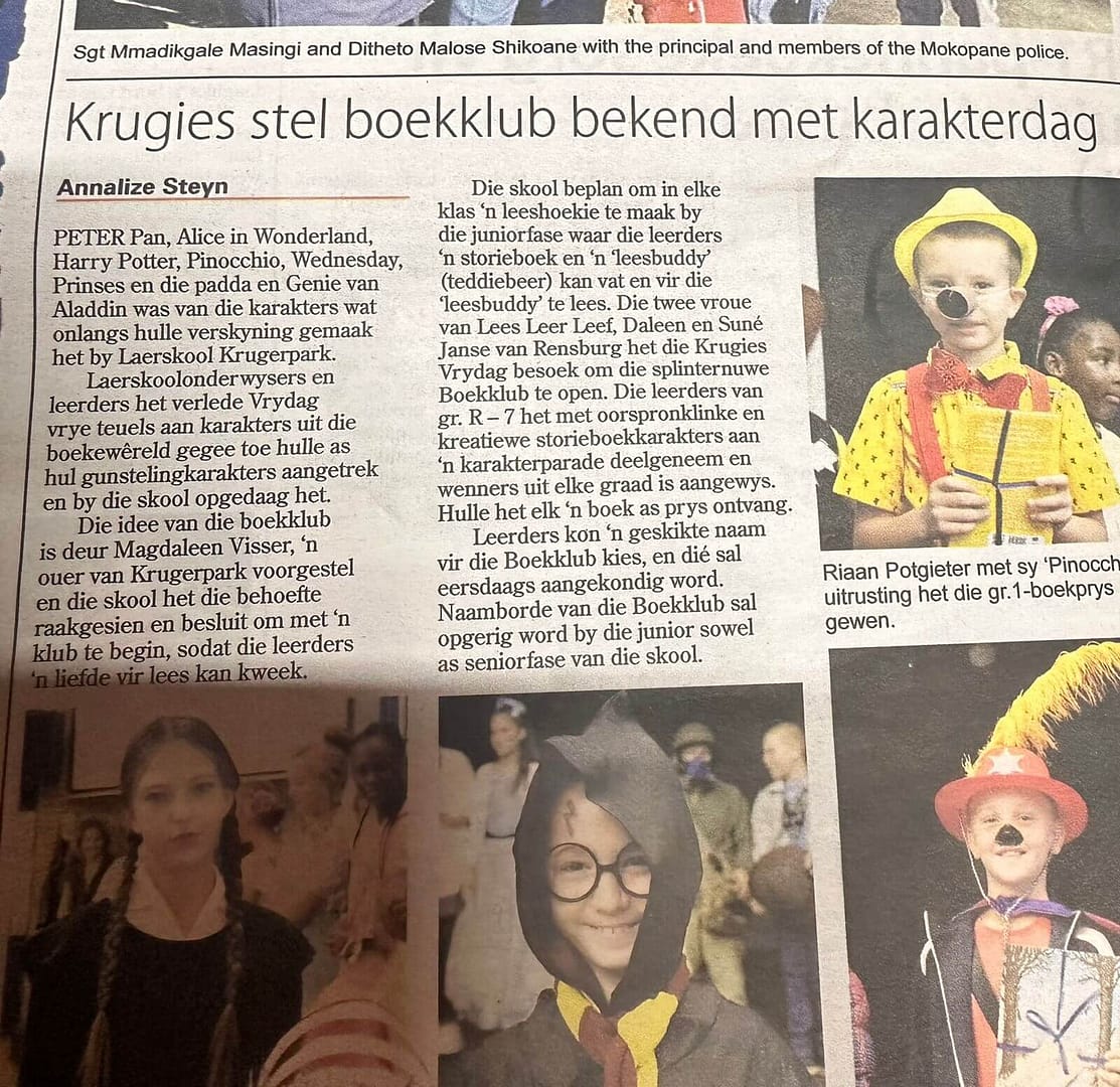 Laerskool Krugerpark het `n Boekklub begin by die skool. Vrydag 26 Mei was daar `n karakterdag by die skool gehou om die opening te vier. Die naam van die boekklub gaan binnekort bekend gemaak word. Elke klas het ook n “boek buddy” vir wie die leerders in die grondslagfase kan lees.