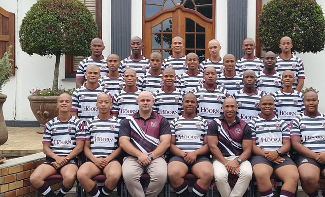 Van links na regs. Zaine Stoltz, Bokamosa Lepheana, Caleb Butler, Umyolise Ntentwana, Tyler Koert, Ruben van Pletzen, Arno Nortje, Mzolisi Mavmbi, Earl Kaseke, Lesendi Ramontseng, Daniel Kretzmann, Nicholas Claase, Thomas Voster. Middel: Zian Scheepers. mnr. Hansie Harmse, Stefan Oelofse, Logan Sweeney-Bushbee Voor: Ravios Jacobs