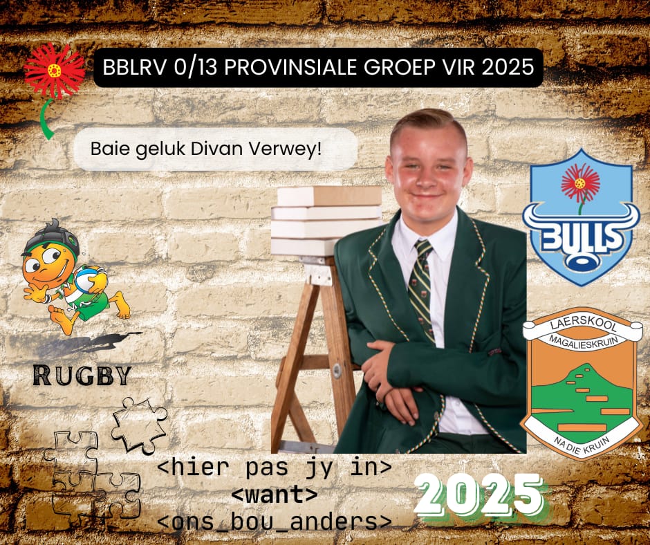 Baie geluk aan Divan Verwey van Laerskool Magalieskruin wat in die Blou Bulle 0/13 span opgeneem is. Ons wens hom alle voorspoed toe met die toernooi wat voorlê.