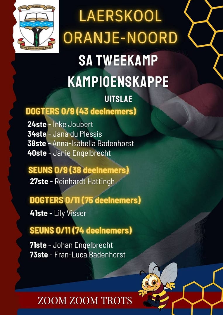Laerskool Oranje-Noord se tweekampafdeling is trots en dankbaar teenoor al die tweekampers wat gedurende Maart aan die Suid-Afrikaanse Tweekampkampioenskappe in Oudtshoorn deelgeneem het. Hul het deelgeneem aan die interlaerskole-kompetisie en is aangewys as die vierde beste laerskoolspan in die land! Die tweekampers het puik presteer en uitstekende plekke behaal.
