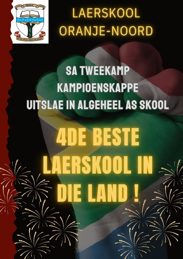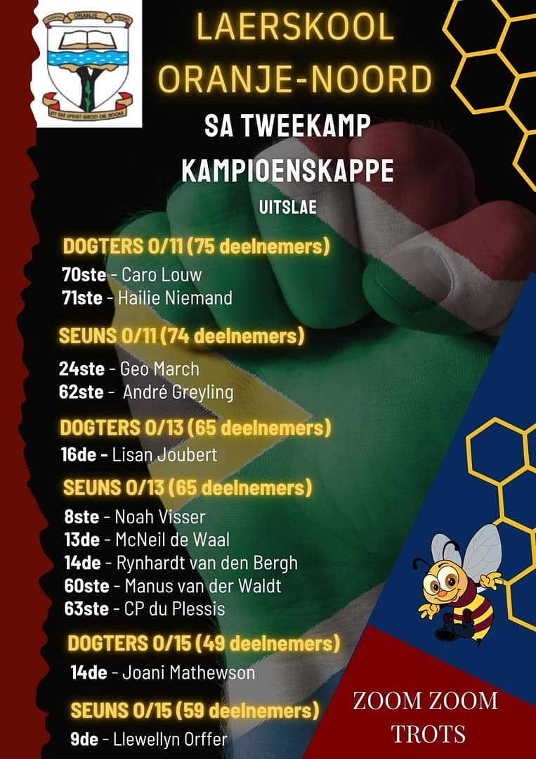 Laerskool Oranje-Noord se tweekampafdeling is trots en dankbaar teenoor al die tweekampers wat gedurende Maart aan die Suid-Afrikaanse Tweekampkampioenskappe in Oudtshoorn deelgeneem het. Hul het deelgeneem aan die interlaerskole-kompetisie en is aangewys as die vierde beste laerskoolspan in die land! Die tweekampers het puik presteer en uitstekende plekke behaal.