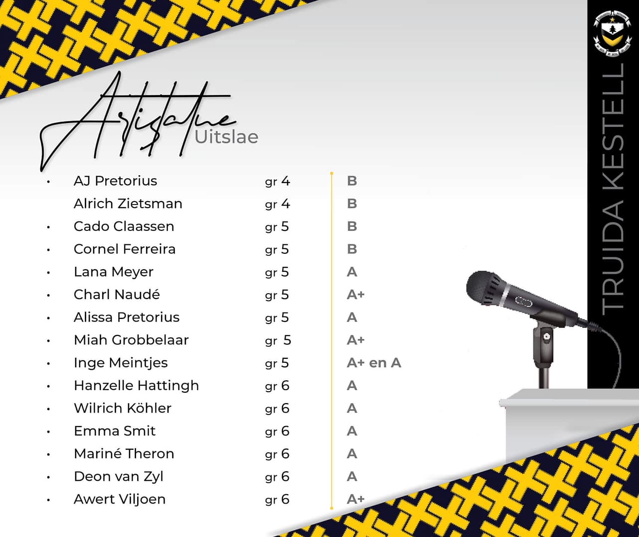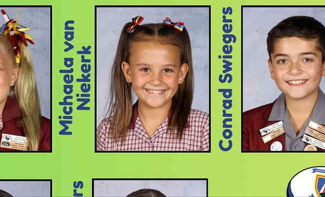 Voor – links na regs: Aart Köhler (gr3); Eduan Amaro (gr2); Charl Naudé (gr5); Janco Köhler (gr4); Liam Amaro (gr6); Awert Viljoen (gr6); Cado Claassen (gr5); Alrich Zietsman (gr4); Cornel Ferreira (gr5); Jéan Ferreira (gr3); Nacah Bosh (gr4); Calum Meyer (gr2) Middel – links na regs: Franzelle van Zyl (gr2); Colene Koch (gr2); Lizé Viljoen (gr3); Hanzelle Hattingh (gr6); Alissa Pretorius (gr5); Christiné Bester (gr7); Nelisa-May Doman (gr7); Lika Zietsman (gr6); Inge Meintjes (gr5); Emma Smit (gr6); Miah Grobbelaar (gr5); Mia Rautenbach (gr3); Biané Hattingh (gr5); Müller Boshch (gr2) Agter – Links na regs: AJ Pretorius (gr4); Deon van Zyl (gr6); Suné Strauss (gr5); Mariné Theron (gr6); Heilene Meintjes (gr6); Koot Bender (gr7); Lucia Botha (gr7); Cara Rautenbach (gr7); Kai de Klerk (gr7); Igna v.d. Riet (gr6); Wilrich Köhler (gr6) Afwesig: Constant Bester (gr1); Andries v.d. Walt (gr2); Lana Meyer (gr5); Lungi Lepesa (gr6); Rozelle Steenkamp (gr6); Francic J.v Rensburg (gr7)
