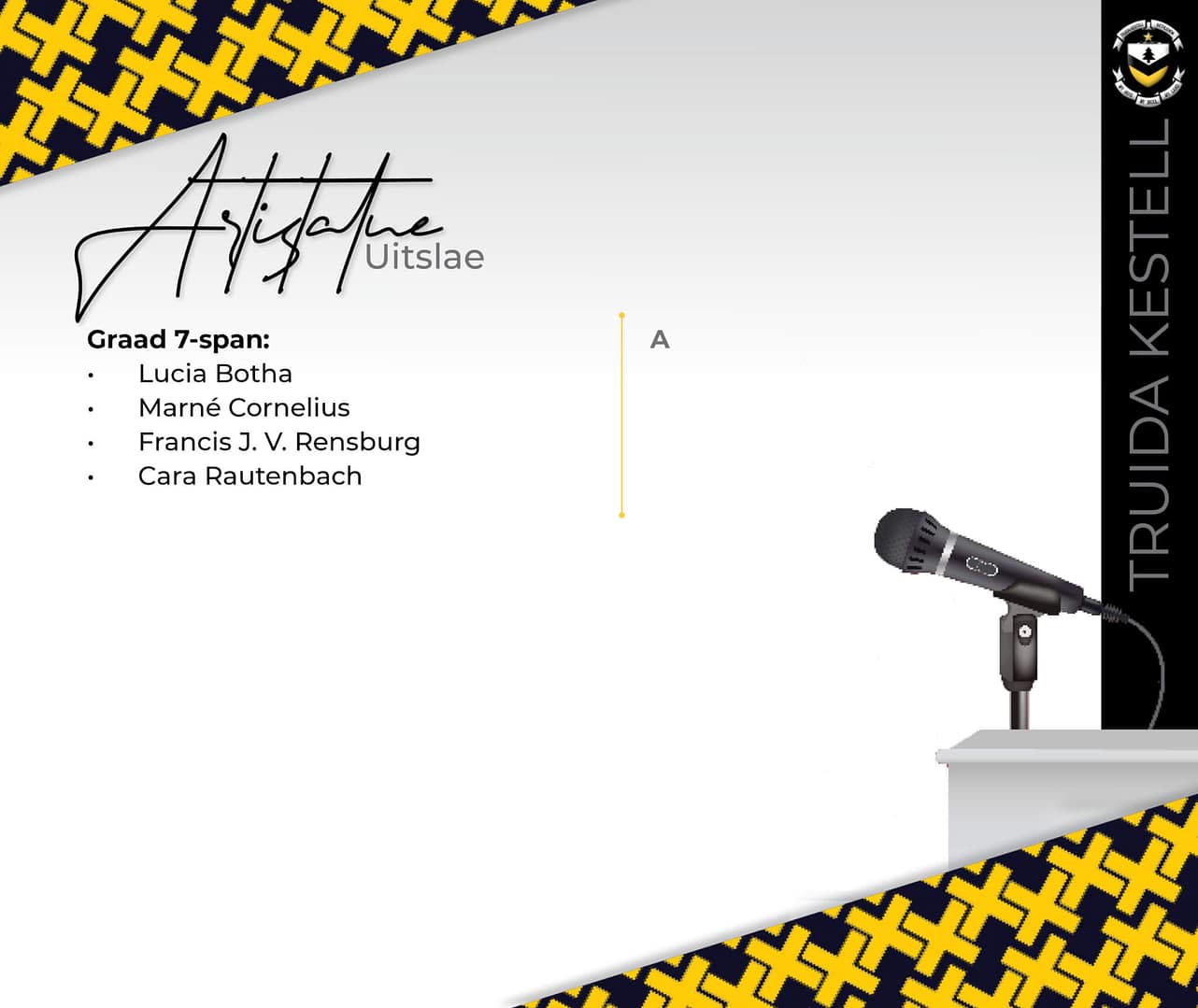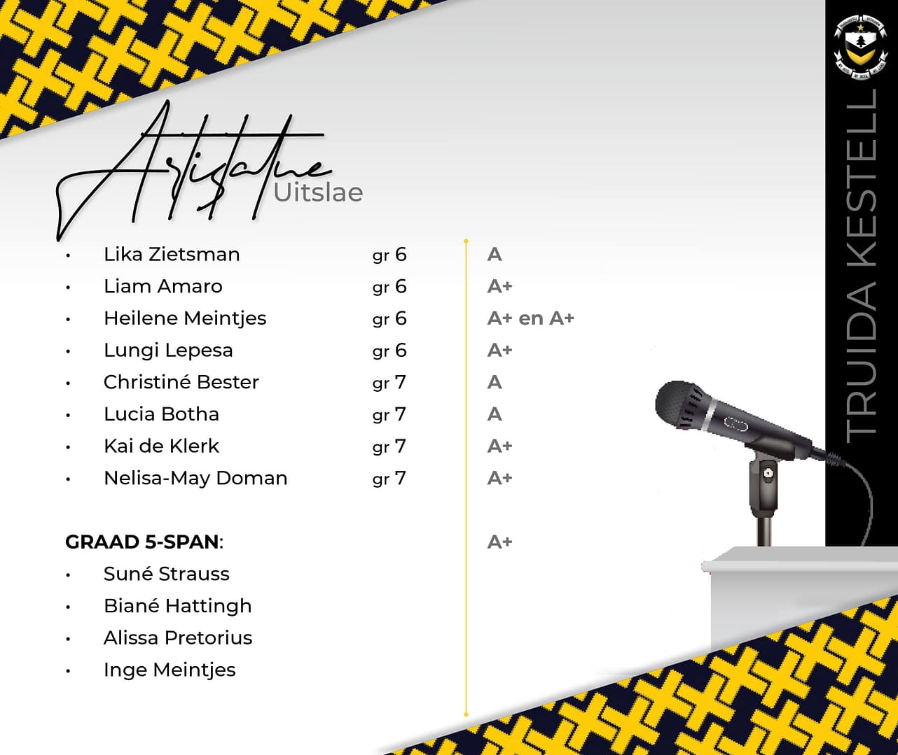 Artistatue Uitslae: Ons sprekers het puik prestasies bereik met die Artistatue Vrystaatrondte wat op 17 Mei by Truida Kestell plaasgevind het Baie geluk met die volgende uitslae.