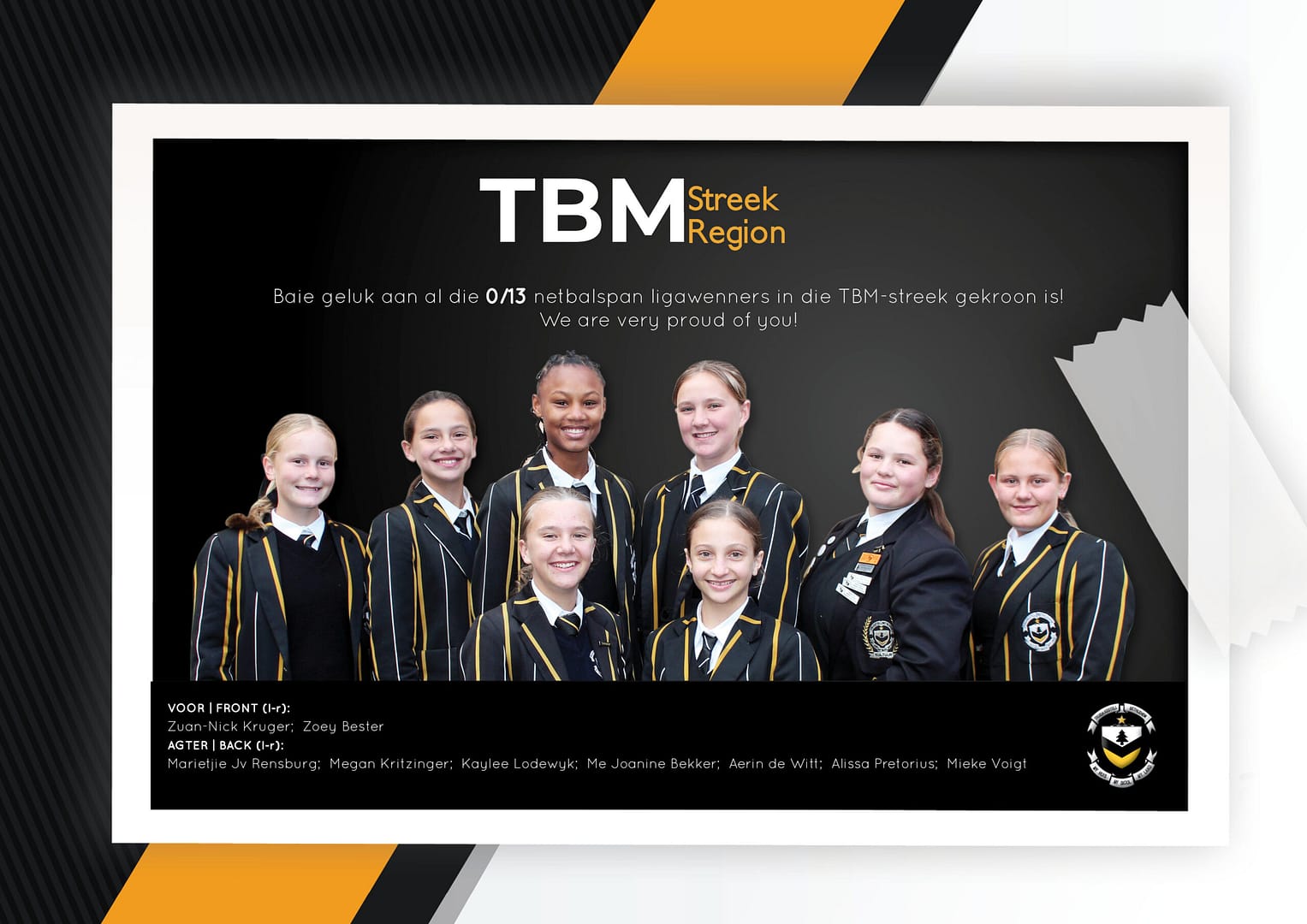 TBM Reeks Baie geluk aan al die 0.13 netbalspan ligawenners in die TBM-streek gekroon is!