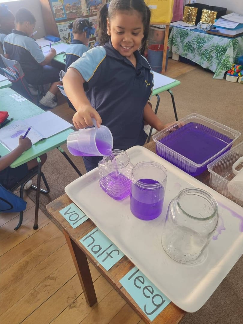 Laerskool WA Joubert se Graad 1-maats het lekker prakties geleer in Wiskunde van Volume. Die pers kleur van die water het hulle selfs gemeet wat is vol, half en leeg.