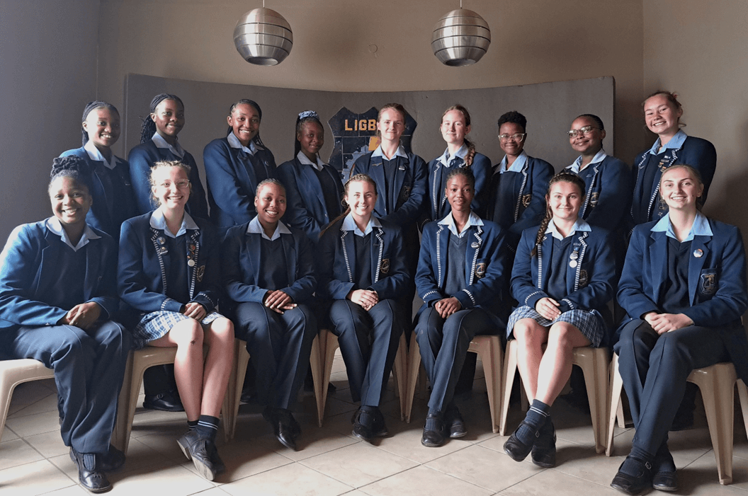 Front: Victoria Hadebe (secretary), Jasmyn Archer (culture), Prosperity Shabalala (deputy head girl), Elandri Kleynhans (head girl), Thandolwethu Mfusi (discipline), Brenda Kirsten (sport), Madelein Ferns (LCA chairperson)