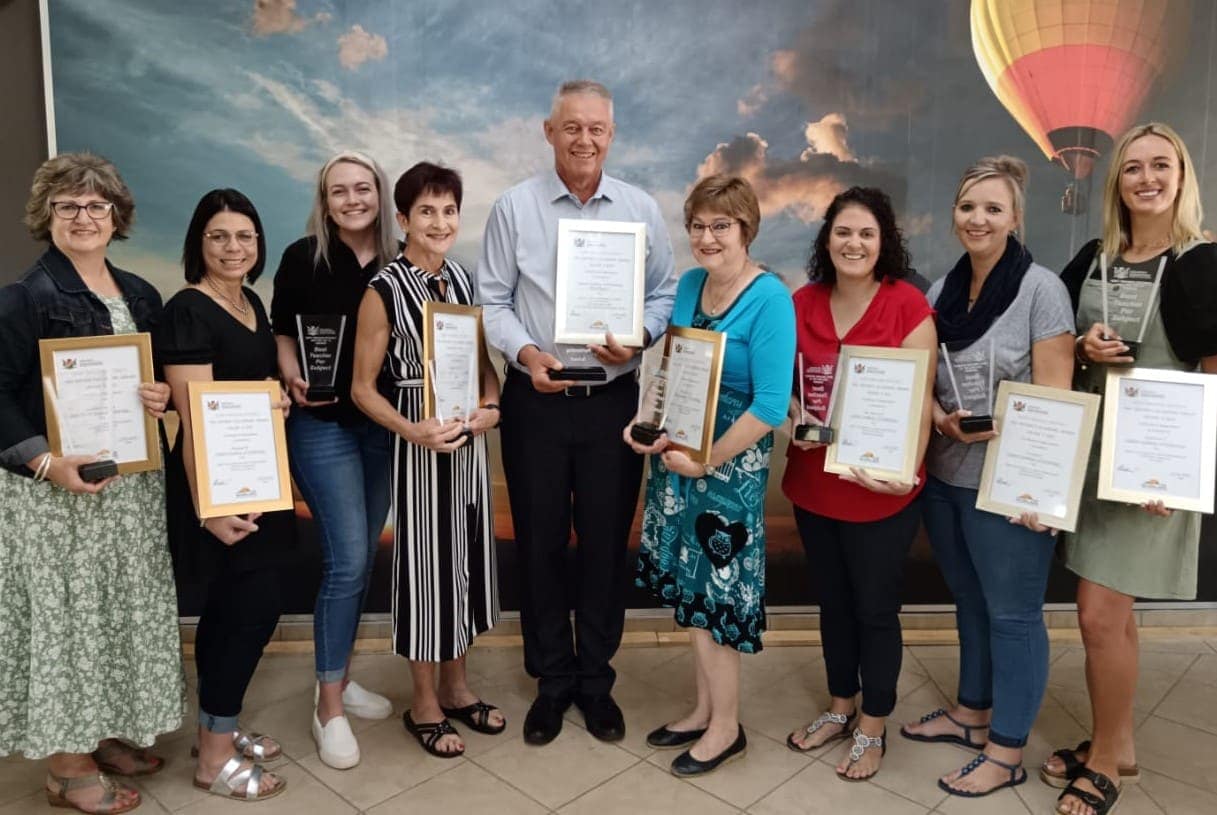 Mses Magda Smit (English Home Language); Magdeli Bosman and Marelize Delport (Physical Science); Lenie van Zyl (Mathematics); Mr Gerhard Brand (principal); Mses Elsa van Zyl (Mathematics); Bianca McKenzie and Leanda Coetzee (Business Studies) and Carinché Pretorius (Tourism).