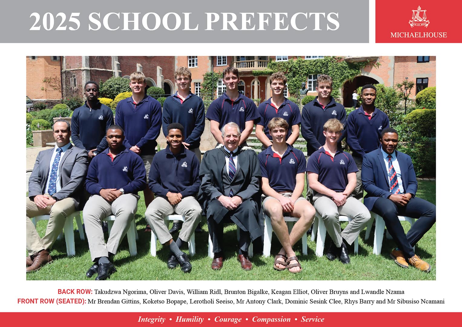 Congratulations to you all. We know you will lead with integrity, humility, compassion and courage in service to our Michaelhouse community.