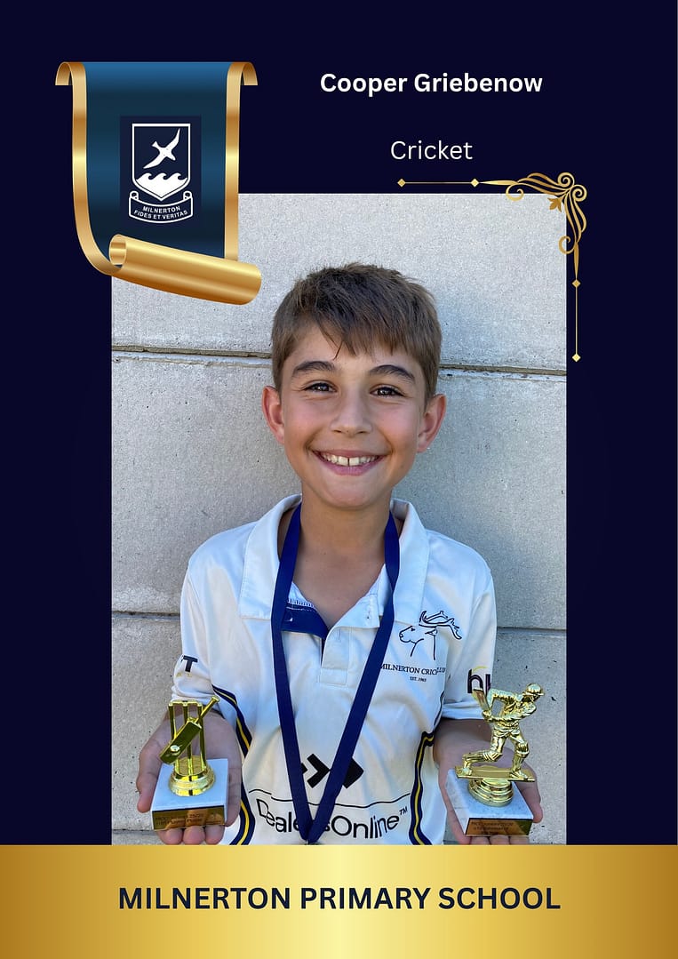 Congratulations to Cooper Griebenow (Grade 4A) learner of Milnerton Primary School on his outstanding success at the Milnerton Cricket Club Annual Prize Giving held on Sunday morning!