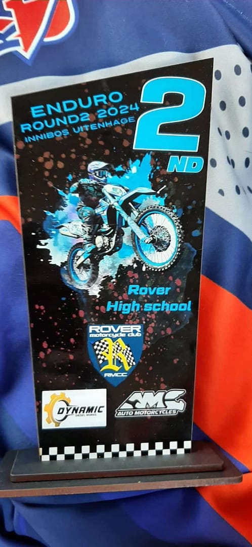Erik Swanepoel het die naweek van die 16de Maart 2024, aan die Rover Motorfietsklub se Enduro tweede rondte deelgeneem. Die rondte was baie vinnig, met n mengsel van los klippe, los grond en sand. Op sekere seksies was daar ‘n topspoed van 120-130 km/h gehaal en moes hy teen die hoë spoed met tye ‘n bult uitry en goed weet waar elke draai sit. Erik moes vier rondtes van ‘n 17km baan voltooi en sy vinnigste tyd per rondte was 20 minute en 43 sekondes. Erik het ‘n tweede plek in die hoërskool afdeling van die wedren verower. Baie geluk Erik!