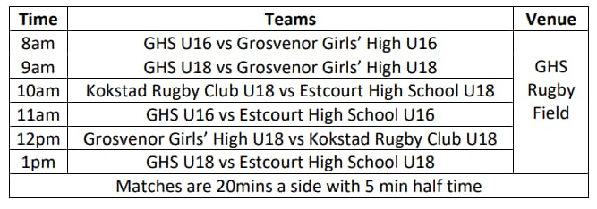 Grosvenor Girls’ High. Teams from Kokstad Rugby Club and Estcourt High School will also compete, with