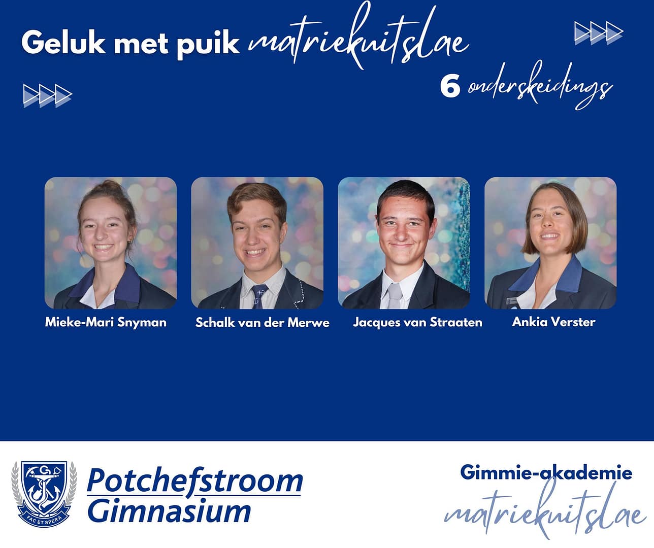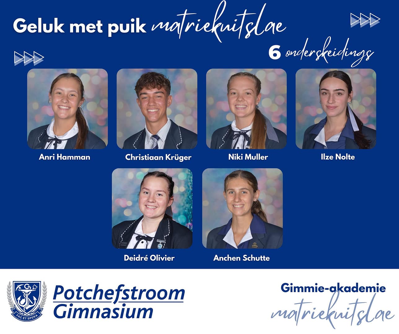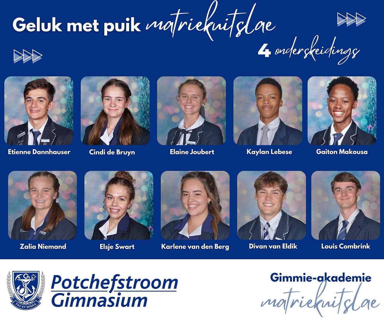 Baie geluk met PUIK uitslae, Potchefstroom Gimnasium matrieks van 2025. Gimmies is baie trots op julle deursettingsvermoë, dissipline en karakter.Dankie aan elke ouer en onderwyser wat deel was van dié spesiale groep leerders se vyf jaar lange reis by Gimmies.