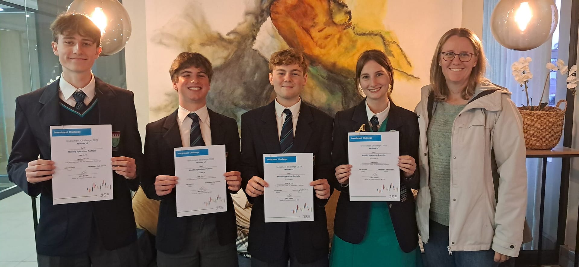 Stellenberg High School is bursting with pride as our powerhouse team – the Jade Hustlers (Imke Nolte, Divan du Toit, Juan Basson & Michael Smuts) – absolutely dominated the JSE Investment Challenge and walked away as the April winners!