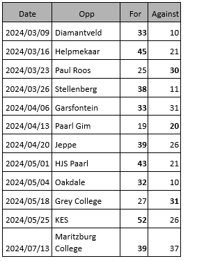 Affies 2024 Season: Affies have showcased their formidable prowess this year, triumphing in 9 of their 12 games. Their only defeats came narrowly against rugby giants Paul Roos, Paarl Gym, and Grey College. Their resilience was evident in their latest nail-biting victory over Maritzburg College away from home. Highlights of their season include memorable wins against Garsfontein and Paarl Boys High, reinforcing their reputation as a powerhouse in schoolboy rugby.